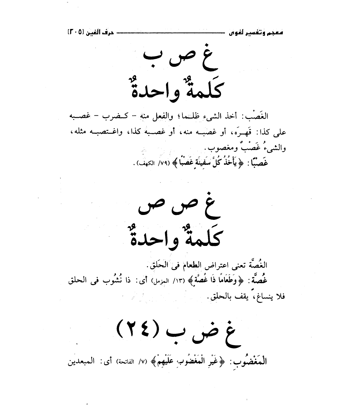غصة: (وَطَعَاماً ذَا غُصَّةٍ) "13/المزمل " أي: ذا نشوب في الحلق فلا ينساغ، ـ يقف بالحلق.