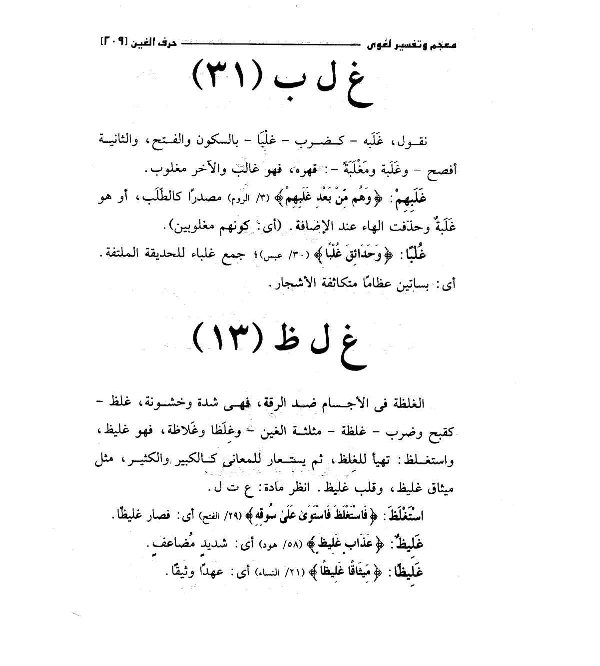 غلبا: (وَحَدَائِقَ غُلْباً) "30/عبس".جمع غلباء للحديقة الملتفة أي: بساتين عظاما متكاثفة الأشجار.