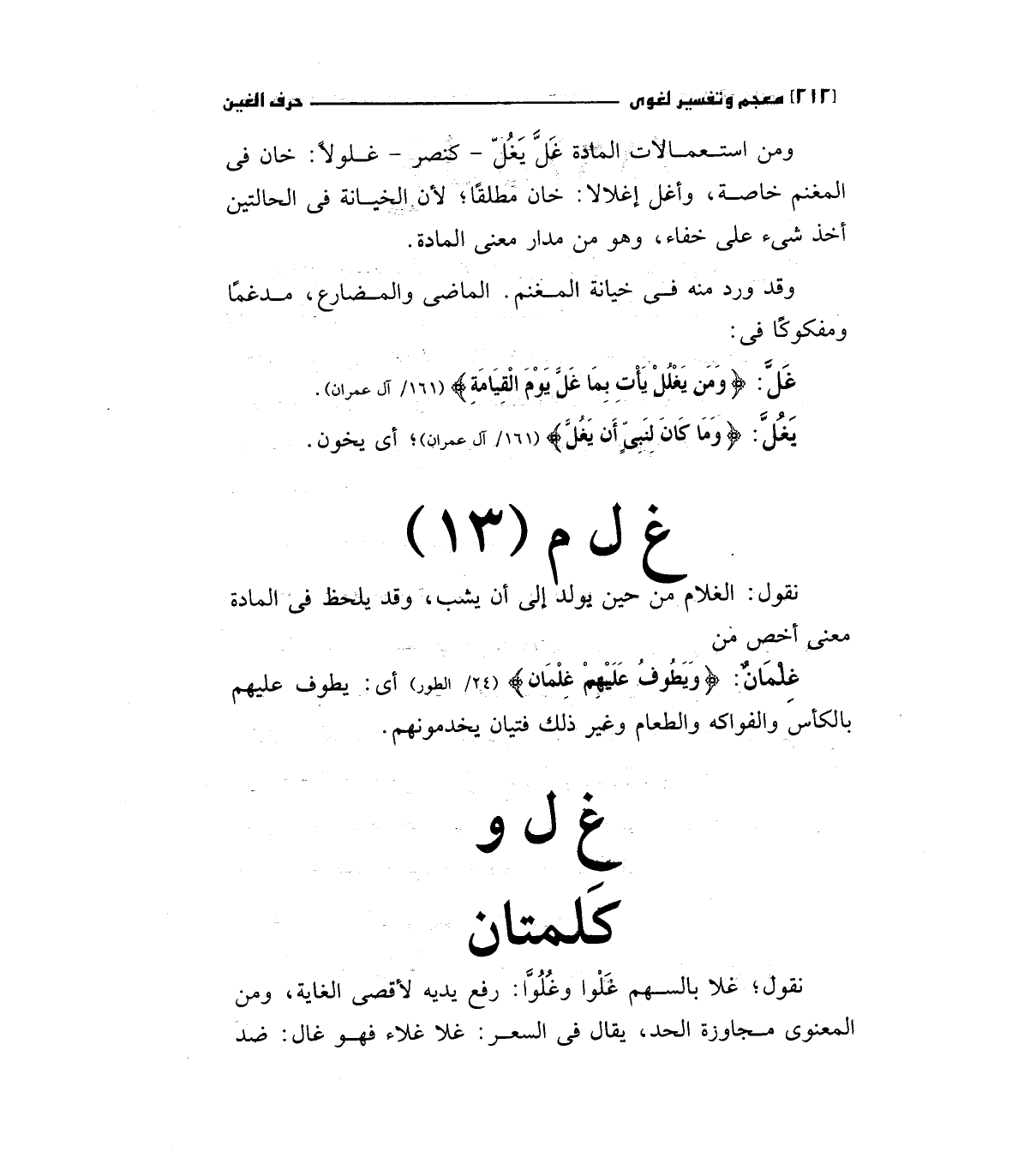 غل: (وَمَنْ يَغْلُلْ يَأْتِ بِمَا غَلَّ يَوْمَ الْقِيَامَةِ) " 161/آل عمران ".