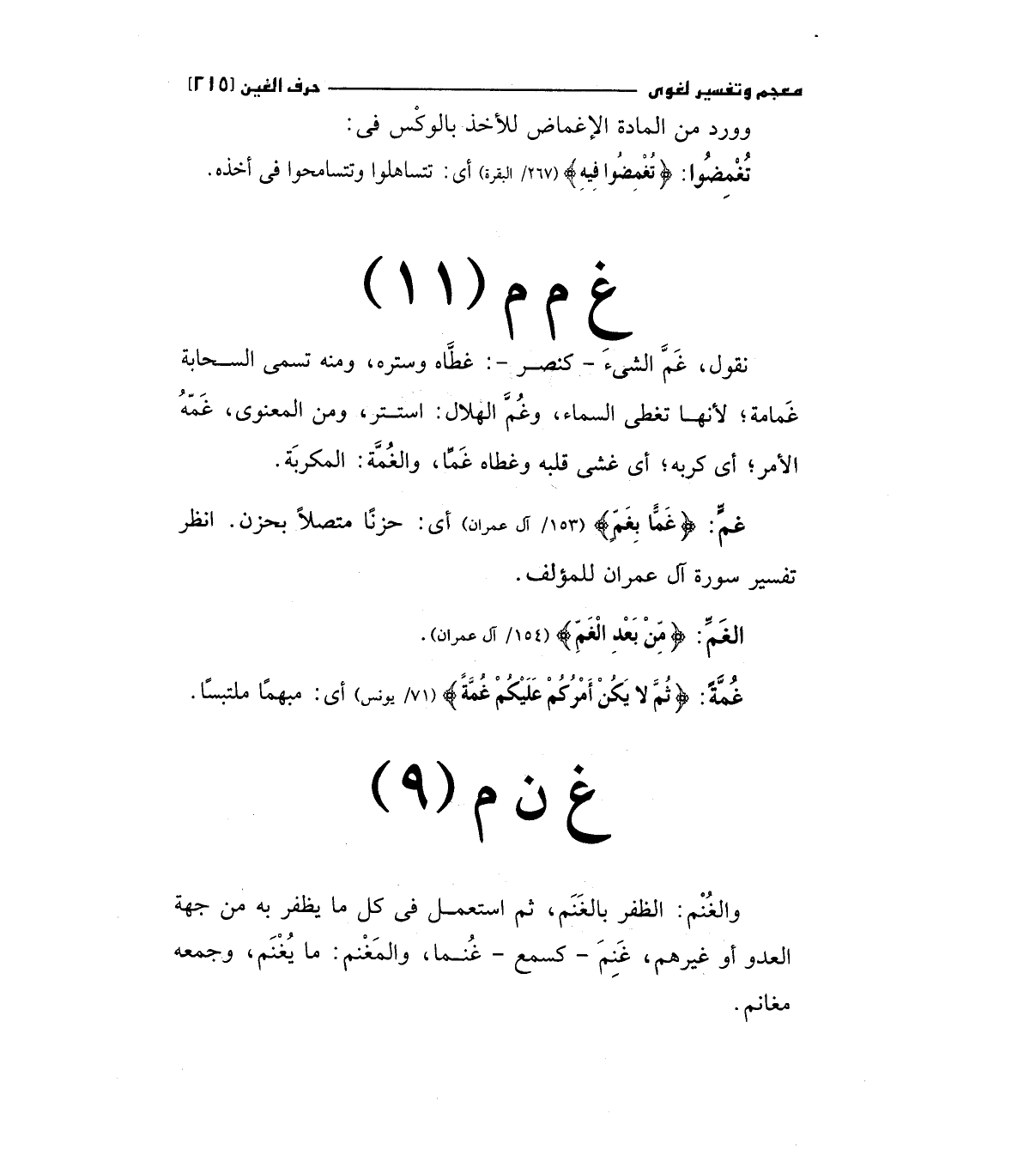 غم: (غَمّاً بِغَمٍّ) " 153/آل عمران " أي: حزنا متصلا بحزن. انظر تفسير سورة آل عمران للمؤلف.
