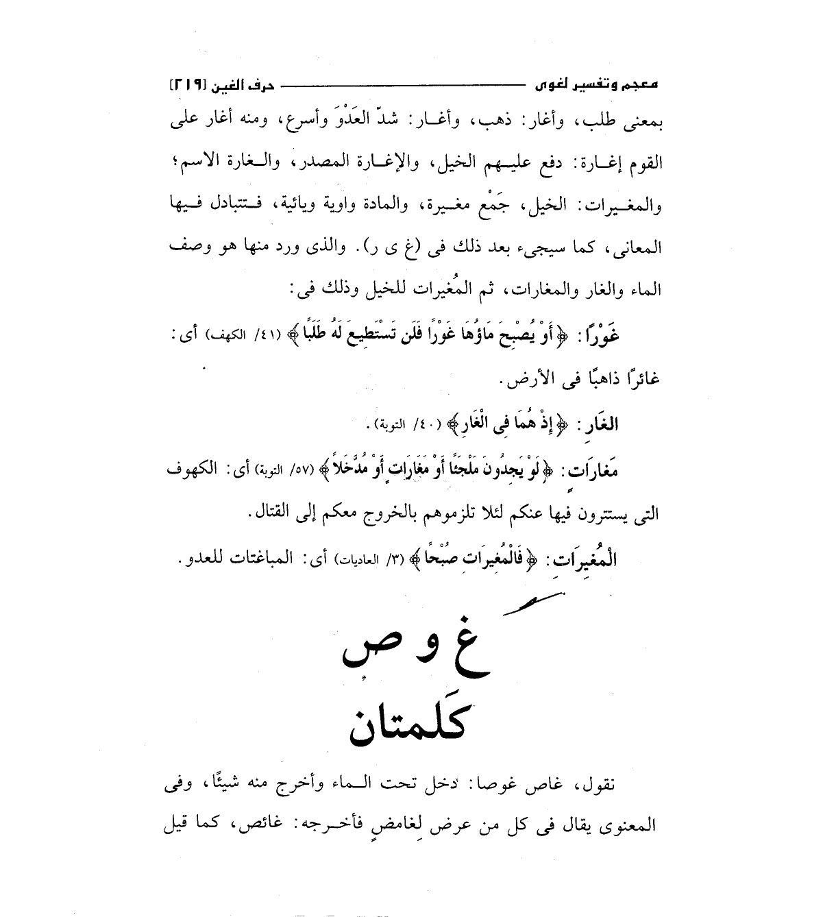 بمعني طلب وأغار: ذهب وأغار: شد العدو وأسرع، ومنه أغار علي القوم إغارة: دفع عليهم الخيل، والإغارة المصدر، والغارة الاسم، والمغيرات: الخيل، جمع مغيرة، والمادة وآوية ويائية، فتتبادل فيها المعاني، كما سيجئ بعد لك في (غ ي ر) والذي ورد منها هو وصف الماء والغار والمغارات، ثم المغيرات للخيل وذلك في: