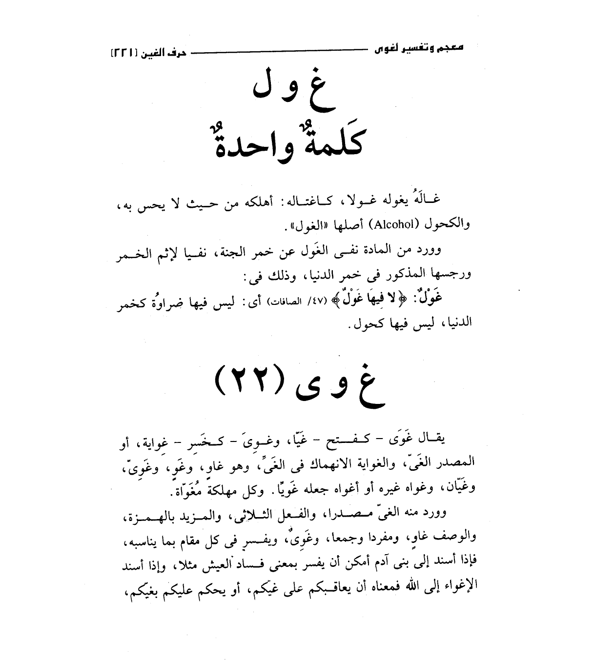 غول: (لا فِيهَا غَوْلٌ) " 47/الصافات " أي: ليس فيها ضراوة كخمر الدنيا، ليس فيها كحول