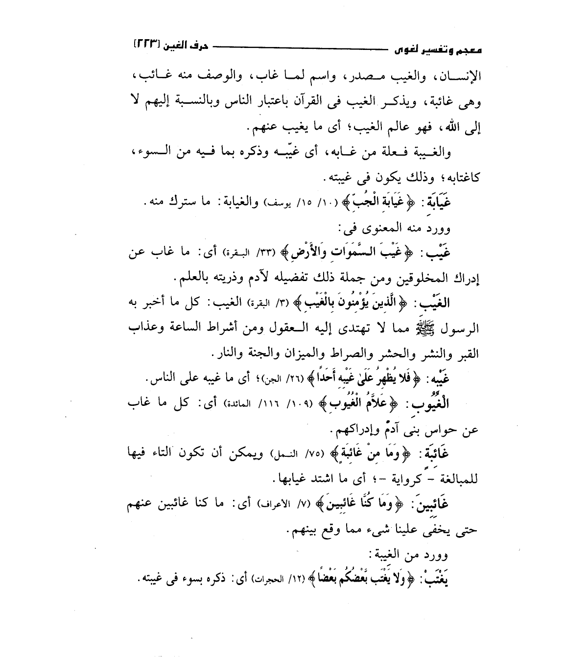 الغيب: (الَّذِينَ يُؤْمِنُونَ بِالْغَيْبِ) "3/البقرة " الغيب: كل ما أخبر به الرسول صلي الله عليه وسلم مما لا تهتدي إليه العقول ومن أشراط الساعة وعذاب القبر والنشر والحشر والصراط والميزان والجنة والنار.