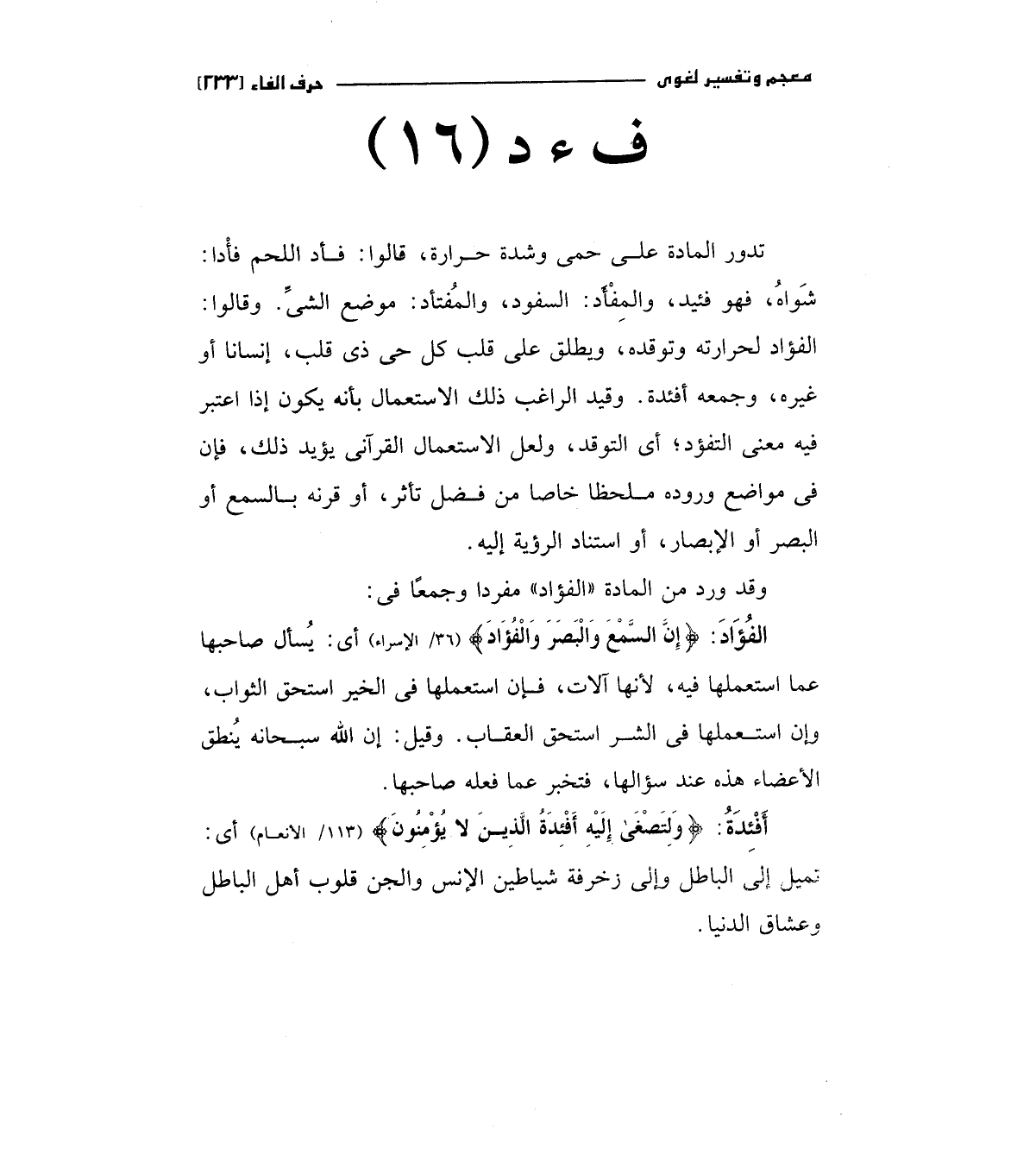 تدور المادة علي حمي وشدة حرارة، قالوا: فأد اللحم فادا: شواه، فهو فئد، والمفاد: السفود، والمفتأد: موضع الشي. وقالوا: الفؤاد لحرارته وتوقدة، ويطلق علي قلب كل حي ذي قلب، إنسانا أو غيره، وجمعه أفئدة، وقيد الراغب ذلك الاستعمال بأنه يكون إذا اعتبر فيه معني التفؤد، أي التوقد، ولعل الاستعمال القرآني يؤيد ذلك، فإن في مواضع وروده ملحظا خاصا منن فضل تأثر، أو قرنه بالسمع أو البصر أية الإبصار، أو استناد الرؤية إليه.