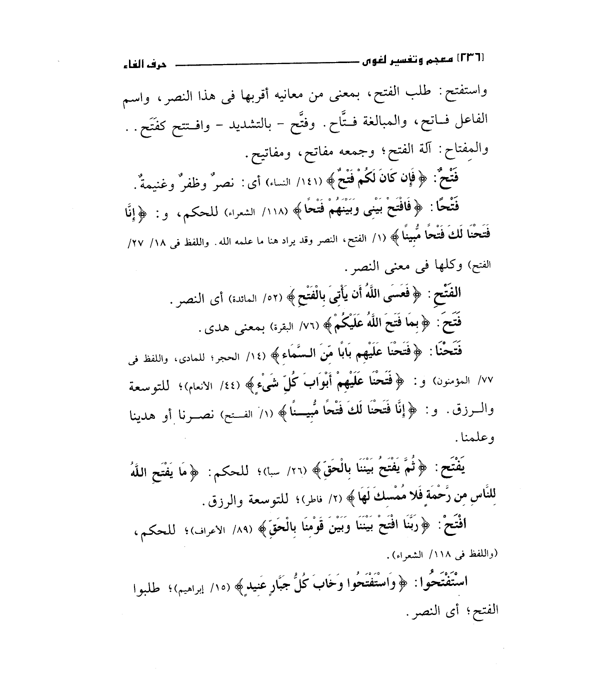 فتح: (فَإِنْ كَانَ لَكُمْ فَتْحٌ) " 141/النساء " أتب: نصر وظفر وغنيمة.