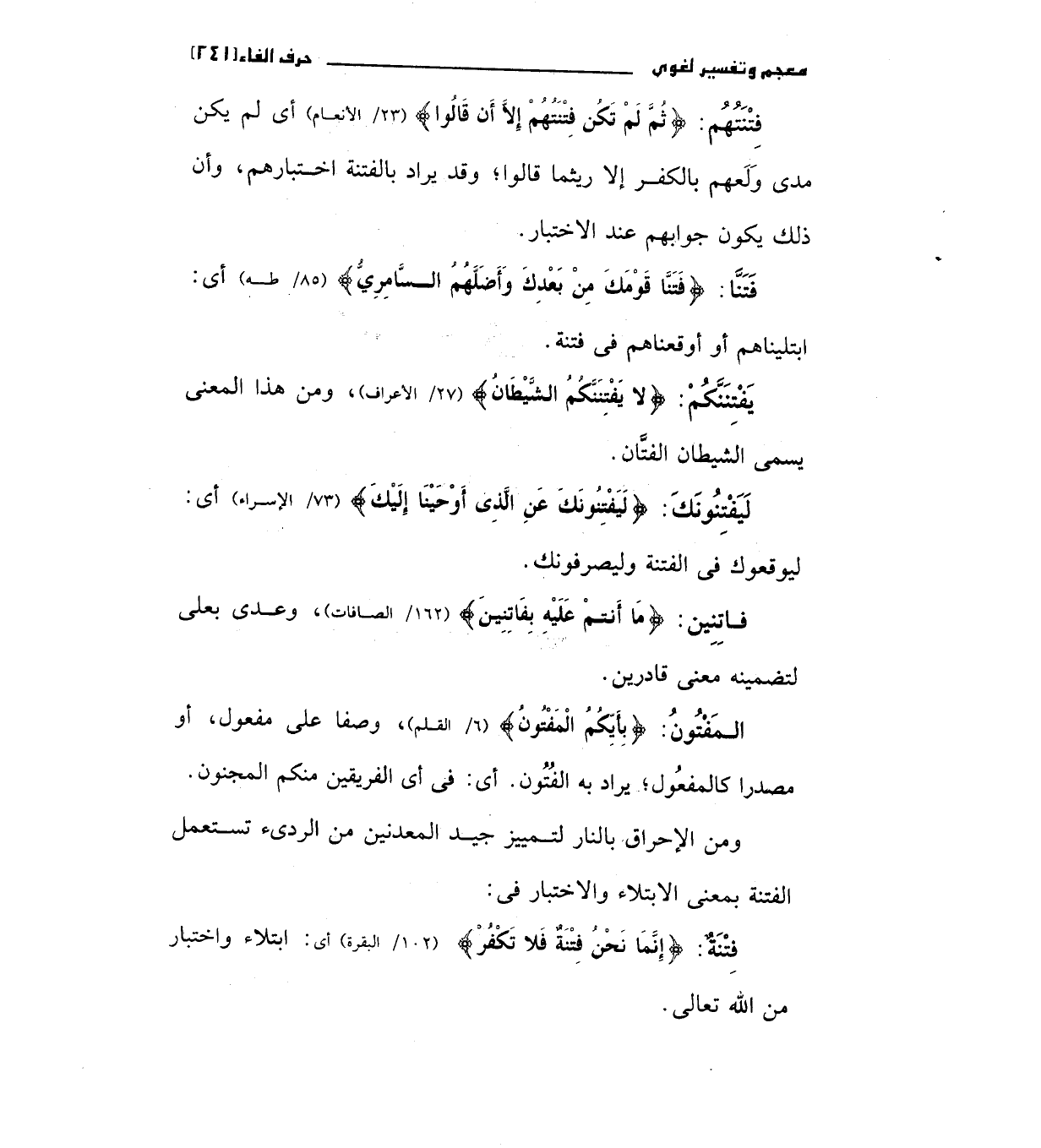 المفتون: (بِأَيِّيكُمْ الْمَفْتُونُ) " 6 - القلم " وصفا علي مفعول أو مصدرا كالمفعول، يراد به الفتون أي: في أي الفريقين منكم المجنون ومن الإحراق بالنار لتمييز جيد المعدنين من الرد تستعمل الفتنة بمعني الابتلاء والاختبار في: