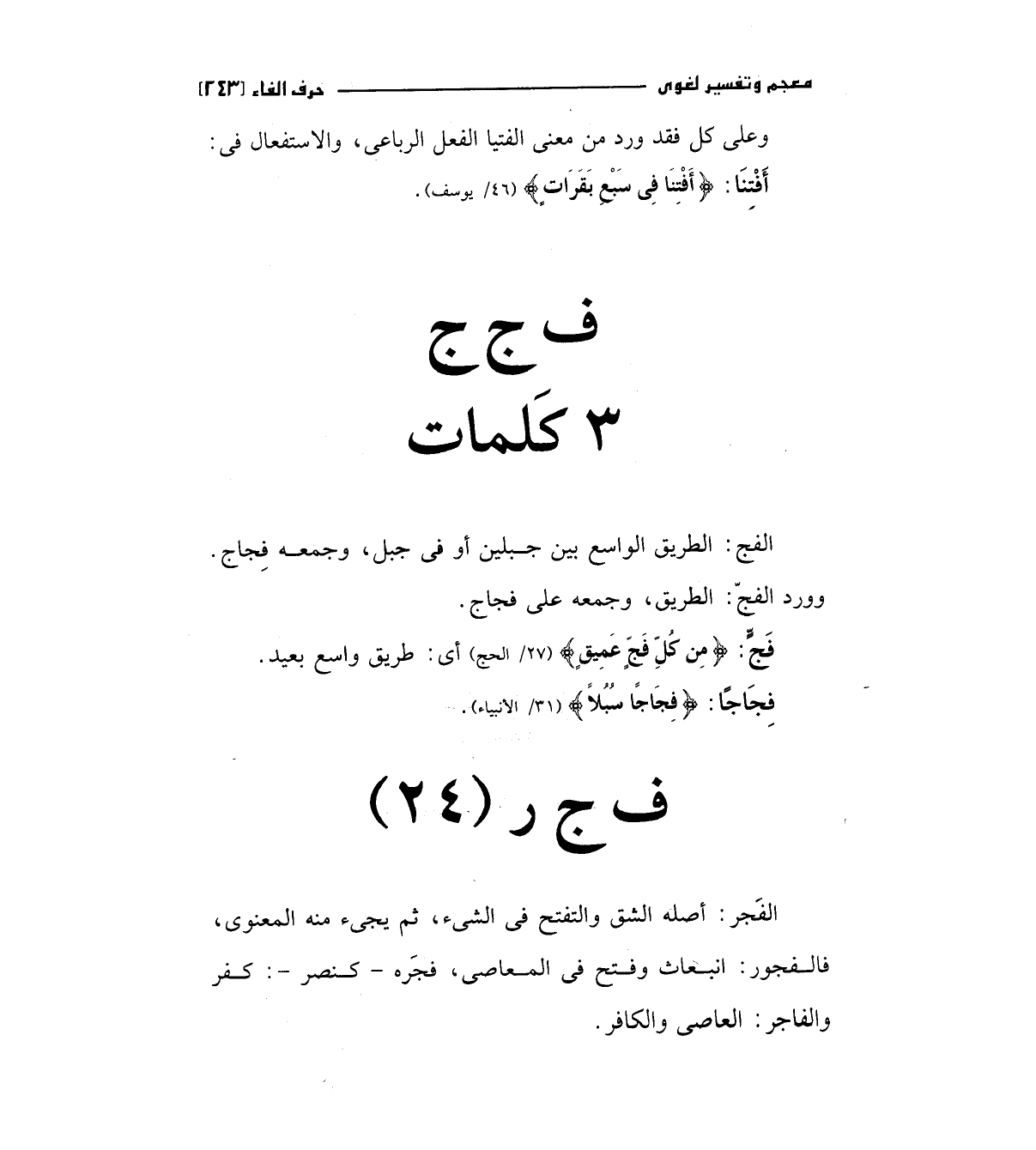 فج: (مِنْ كُلِّ فَجٍّ عَمِيقٍ) " 27/الحج " أي: طريق واسع بعيد