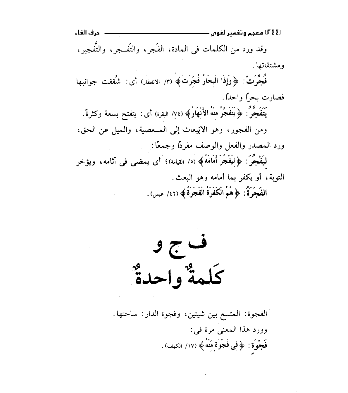 ومن الفجور، وهو الانبعاث إلي المعصية، والميل عن الحق، ورد المصدر والفعل والوصف مفردا وجمعا: