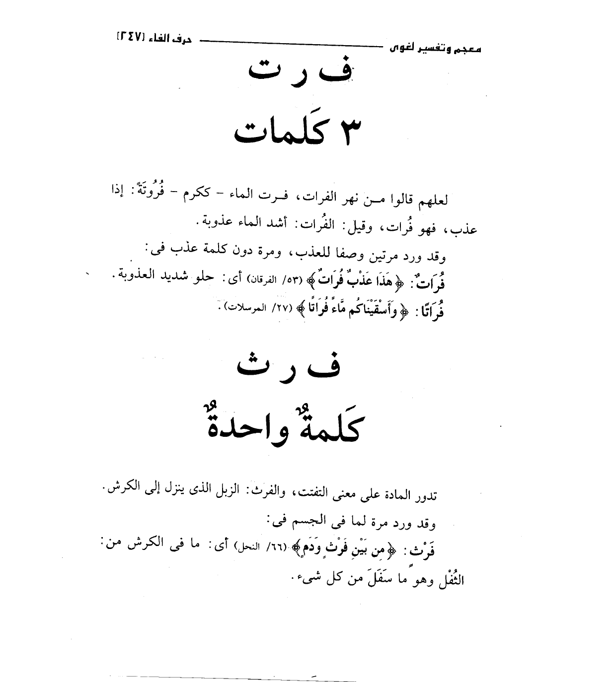 فرات: (هَذَا عَذْبٌ فُرَاتٌ) " 53 - الفرقان" أي: حلو شديد العذوبة