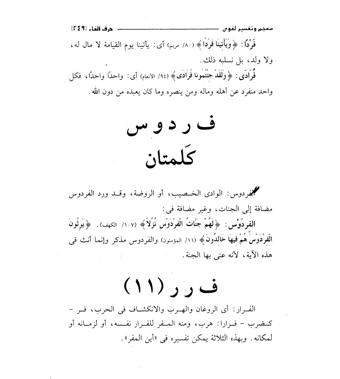الفردوس: (لَهُمْ جَنَّاتُ الْفِرْدَوْسِ نُزُلاً) " 107/الكهف " (يَرِثُونَ الْفِرْدَوْسَ هُمْ فِيهَا خَالِدُونَ) " 11/المؤمنون " والفردوس مذكر وإنما أنث في هذه الآية، لأنه عني بها الجنة.