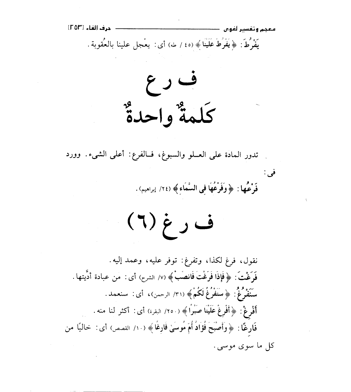 فارغا: (وَأَصْبَحَ فُؤَادُ أُمِّ مُوسَى فَارِغاً) " 10/القصص ". أي: خاليا من كل ما سوي موسي.