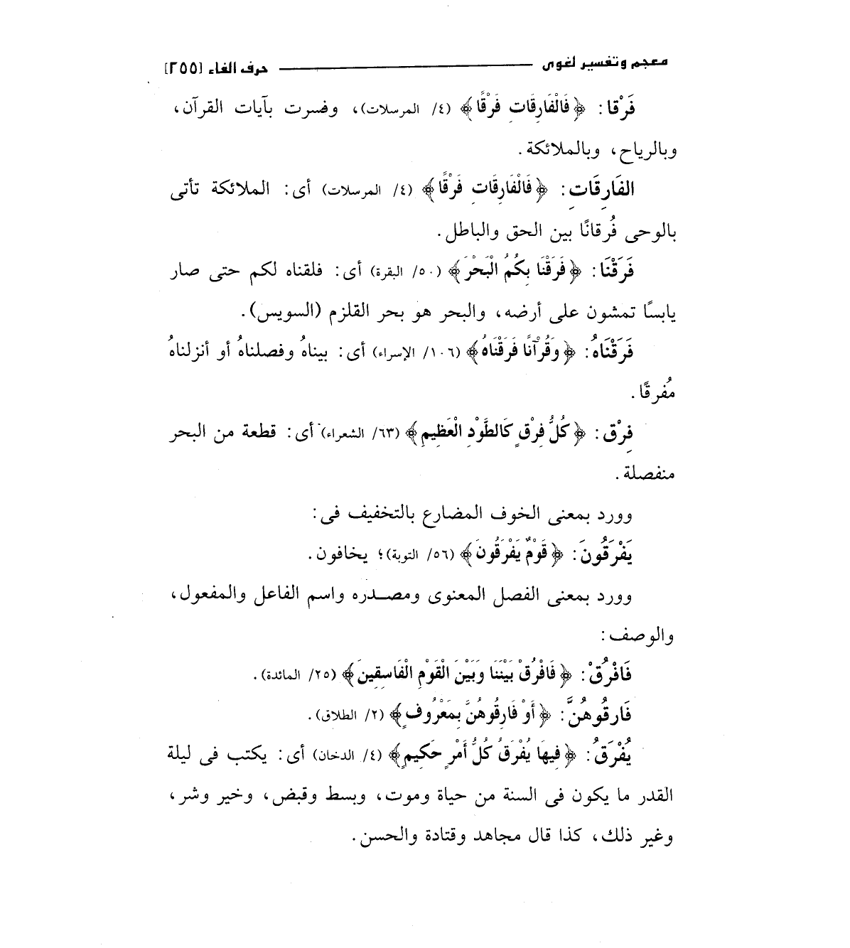فرقا: (فَالْفَارِقَاتِ فَرْقاً) " 4/المرسلات) فسرت بآيات القرآن وبالرياح وبالملائكة.