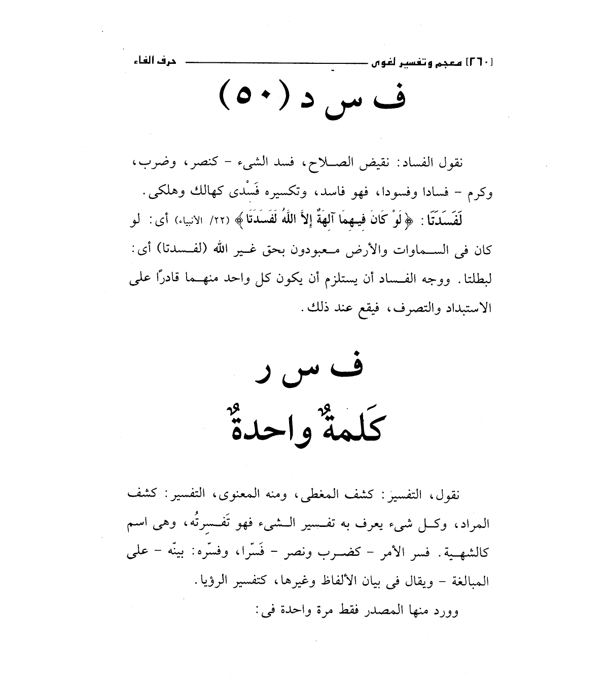 نقول الفساد: نقيض الصلاح، فسد الشئ - كنصر، وضرب وكرم - فسادا وفسودا، فهو فاسد، وتكسيره فسدي كهالك وهلكي لفسدتا: (لَوْ كَانَ فِيهِمَا آلِهَةٌ إِلاَّ اللَّهُ لَفَسَدَتَا) " 22/الأنبياء " أي: لو كان في السماوات والأرض معبودون بحق غير الله (لفسدتا) أي: لبطلتا ووجه الفساد أن يستلزم أن يكون كل واحد منهما قادرا علي الاستبداد والتصرف، فيقع عند ذلك.