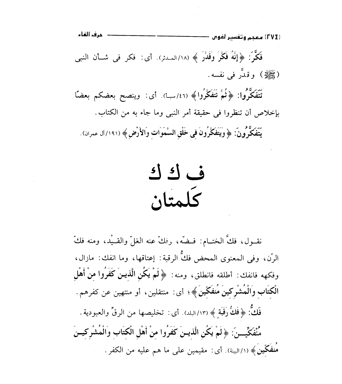 نقول، فك الختام: فضه، وفك عنه الغل والقيد، ومنه فك الزن وفي المعنوي المحض فك الرقبة: إعتاقها، وما انفك: مازال، وفكهة فانفك: أطلقه فانطلق، ومنه: (لم يكن الذين كفروا من أهل الكتاب والمشركين منفكينة) أي: منتقلين، أو منتهين عن كفرهم.
