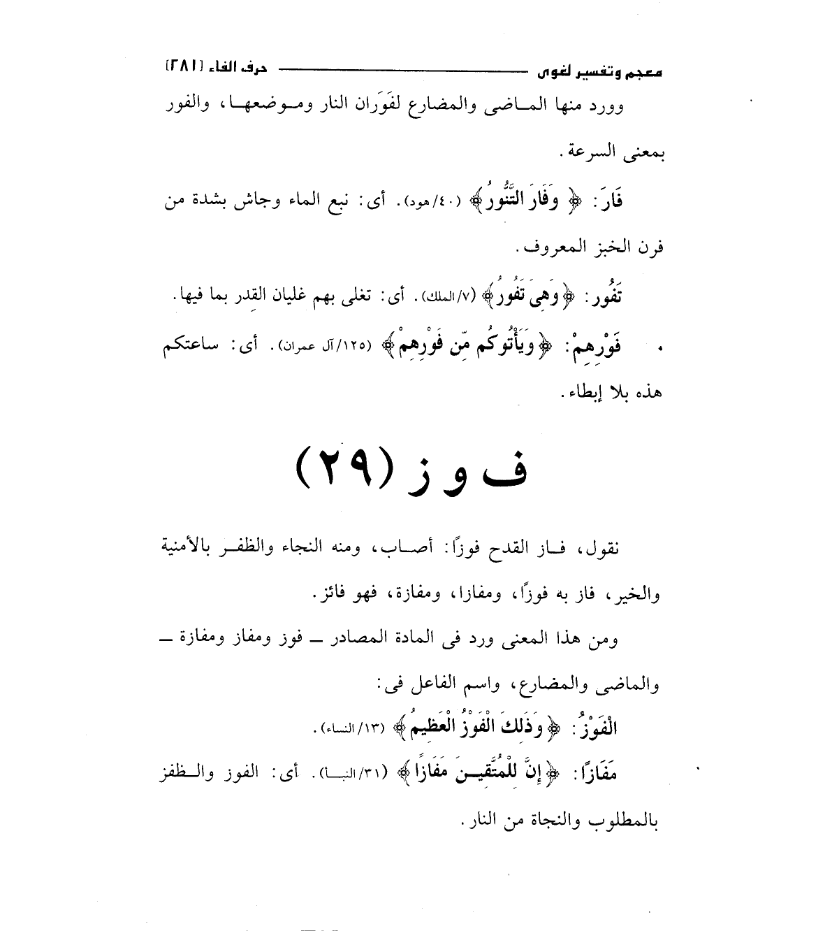 ومن هذا المعني ورد في المادة المصادر - فوز ومفاز ومفازة - والماضي والمضارع، واسم الفاعل في:
