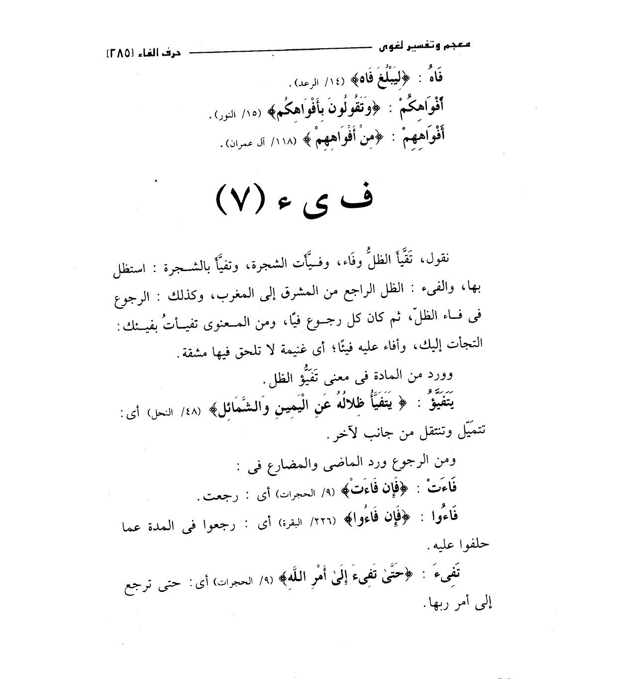 نقول، تقيا الظل وفاء، وفيات الشجرة، وتفيا بالشجرة: استظل بها، والفئ: الظل الراجع من المشرق إلي المغرب، وكذلك: الرجوع في فاء الظل، ثم كان كل رجوع فيا، ومن المعنوي تقيأت بفيئك: التجأت إليك، وأفاء عليه فيئا، أي غنيمة لا تلحق فيها مشقة.