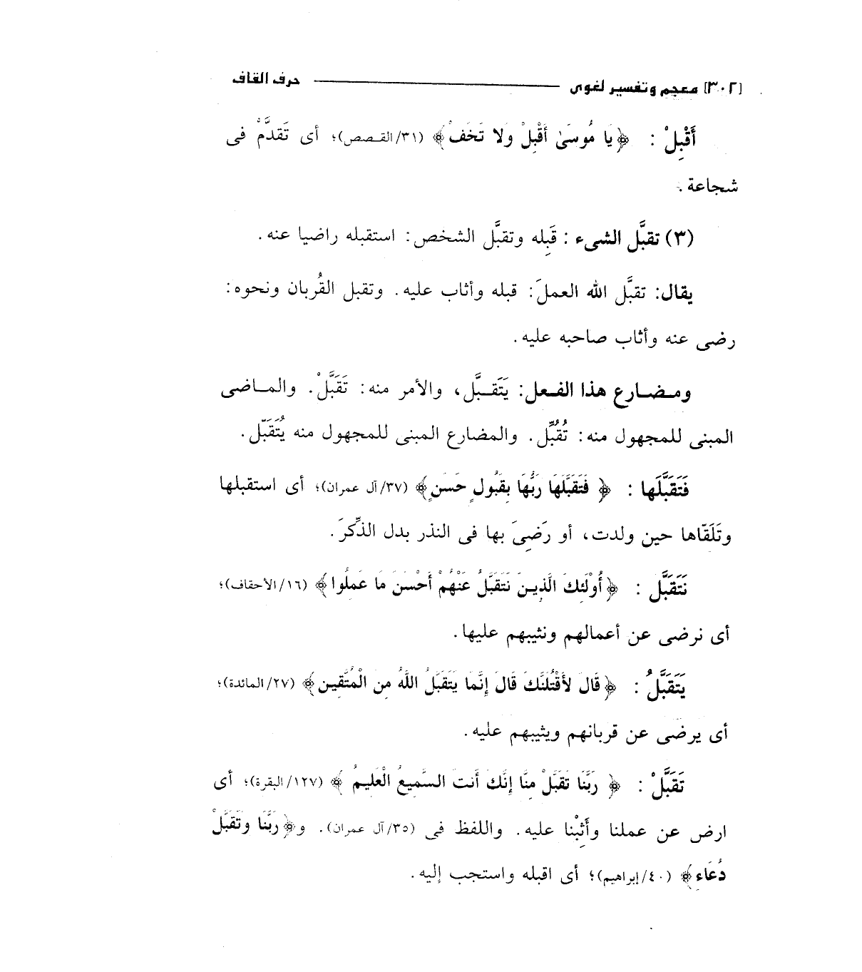 تقبل: (رَبَّنَا تَقَبَّلْ مِنَّا إِنَّكَ أَنْتَ السَّمِيعُ الْعَلِيمُ) " 127/البقرة " أي أرض عن عملنا وأثبنا عليه. واللفظفي " 35/آل عمران " و (رَبَّنَا وَتَقَبَّلْ دُعَاءِ) " 40/إبراهيم " أي اقبله واستجب إليه.