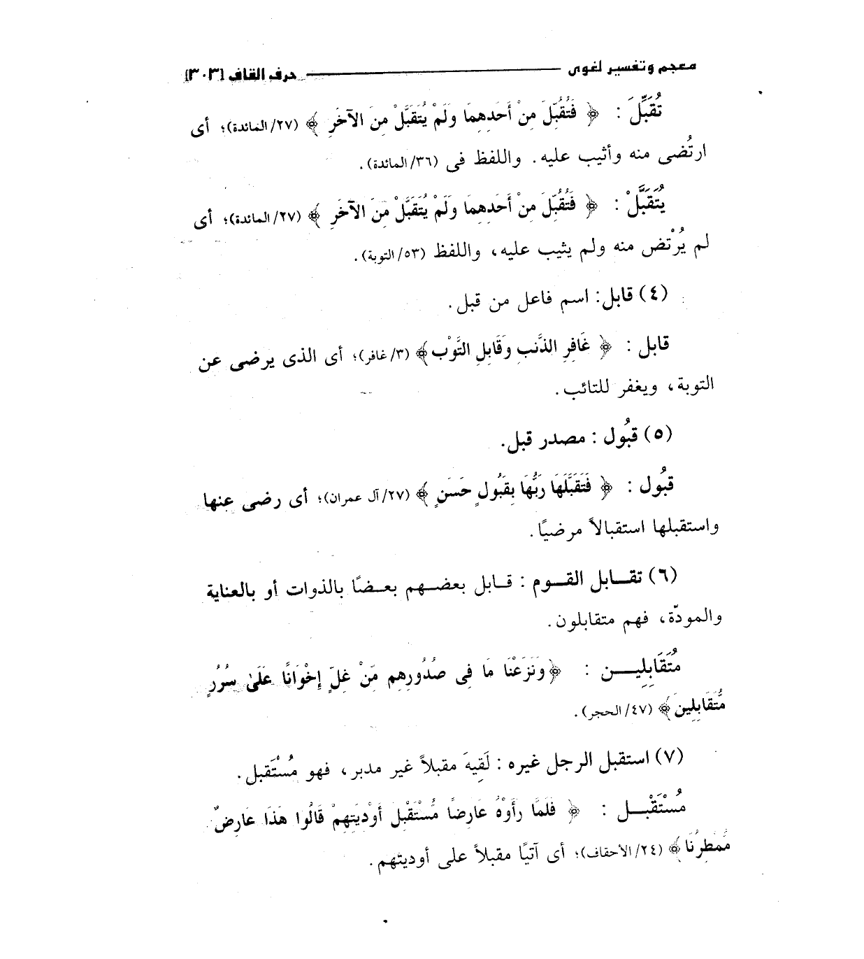 تقبل: (فَتُقُبِّلَ مِنْ أَحَدِهِمَا وَلَمْ يُتَقَبَّلْ مِنْ الآخَرِ) " 27/المائدة ".أي منه وأثيب عليه واللفظ في " 36/المائدة ".