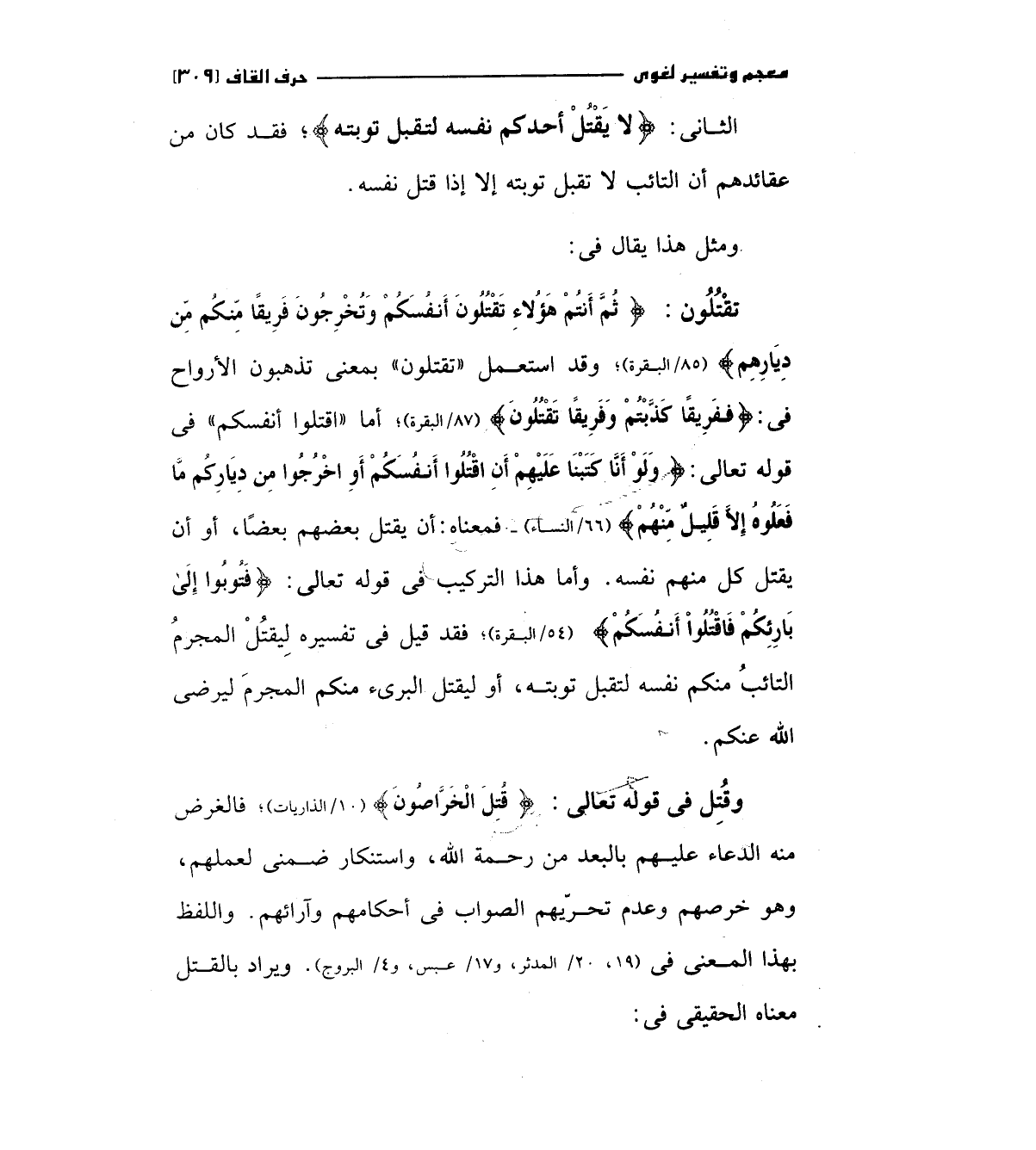 تقتلون: (ثُمَّ أَنْتُمْ هَؤُلاء تَقْتُلُونَ أَنفُسَكُمْ وَتُخْرِجُونَ فَرِيقاً مِنْكُمْ مِنْ دِيَارِهِمْ) " 85/البقرة " وقد استعمل " تقتلون" بمعني تذهبون الأرواح في: (فَفَرِيقاً كَذَّبْتُمْ وَفَرِيقاً تَقْتُلُونَ) " 87/البقرة " أما " اقتلوا أنفسكم " في قوله تعالي: (وَلَوْ أَنَّا كَتَبْنَا عَلَيْهِمْ أَنْ اقْتُلُوا أَنفُسَكُمْ أَوْ اخْرُجُوا مِنْ دِيَارِكُمْ مَا فَعَلُوهُ إِلاَّ قَلِيلٌ مِنْهُمْ) " 66/النساء" فمعناه أن يقتل بعضهم بعضا، أو أن يقتل كل منهم نفسه. وأما هذا التركيب في قوله تعالي: (فَتُوبُوا إِلَى بَارِئِكُمْ فَاقْتُلُوا أَنفُسَكُمْ) " 54/البقرة " فقد قيل في تفسيره ليقتل المجرم التائب منكم نفسه لتقبل توبته، أو ليقتل البرئ منكم المجرم ليرضي الله عنكم.