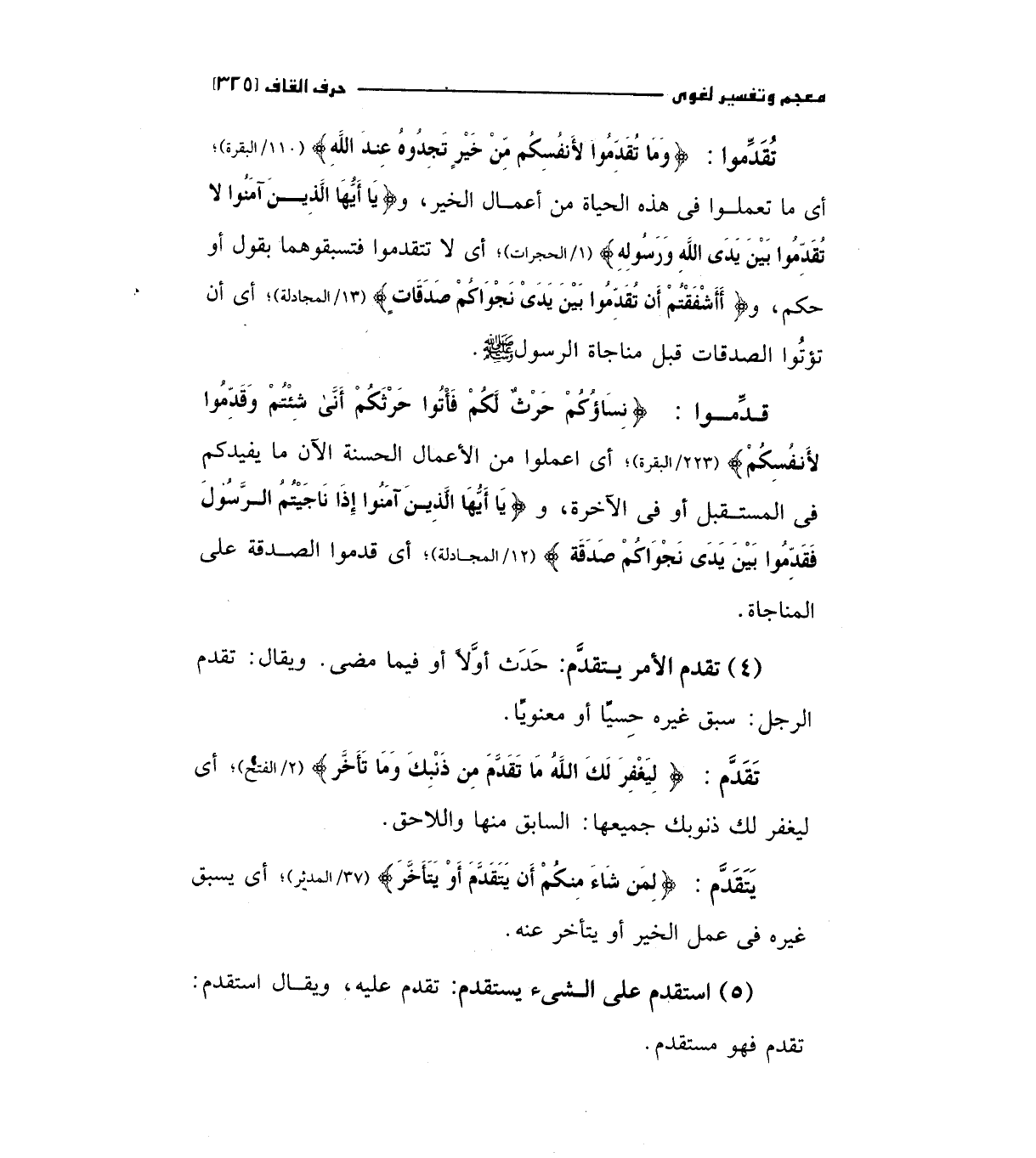 تقدموا: (وَمَا تُقَدِّمُوا لأَنفُسِكُمْ مِنْ خَيْرٍ تَجِدُوهُ عِنْدَ اللَّهِ) " 110/البقرة " أي ما تعلموا في هذه الحياة من أعمال الخير، (يَا أَيُّهَا الَّذِينَ آمَنُوا لا تُقَدِّمُوا بَيْنَ يَدَيْ اللَّهِ وَرَسُولِهِ) " 1/الحجرات" أي لا تتقدموا فتسبقوهما بقول أو حكم، و (أَأَشْفَقْتُمْ أَنْ تُقَدِّمُوا بَيْنَ يَدَيْ نَجْوَاكُمْ صَدَقَاتٍ) " 13/المجادلة " أي أن تؤتوا الصدقات قبل مناجاة الرسول صلي الله عليه وسلم.