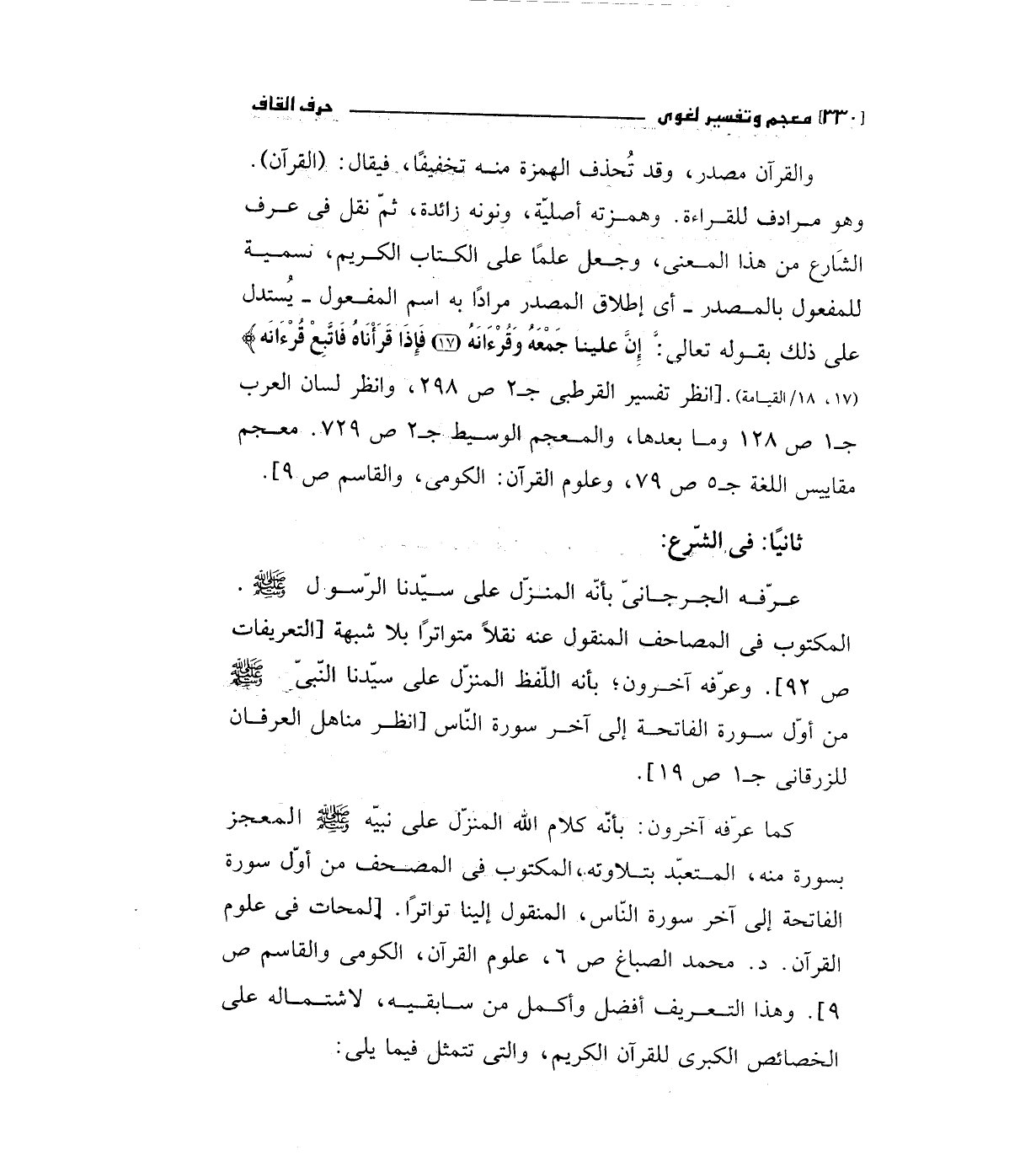 ثانيا: فى الشرع: عرفه الجرجاني بانه المنزل علي سيدنا الرسول صلي الله عليه وسلم المكتوب في المصاحف المنقول عنه نقلا متواترا بلا شبهة (التعريفات ص 92) وعرفه آخرون بانه اللفظ المنزل علي سيدنا النبي صلي الله عليه وسلم من أول سورة الفاتحة إلي أخر سورة الناس (انظر مناهل العرفان للزرقاني ج1ص 19.