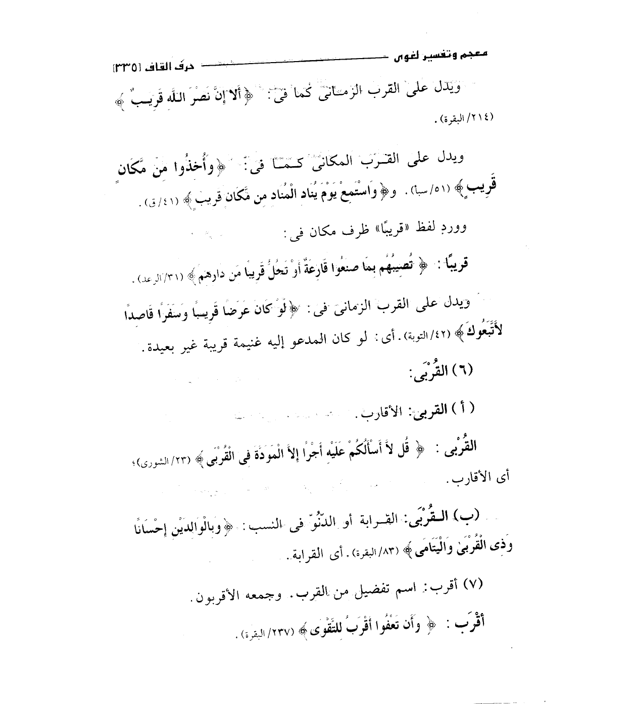 ب- القربي: القرابة أو الدنو في النسب: (وَبِالْوَالِدَيْنِ إِحْسَاناً وَذِي الْقُرْبَى وَالْيَتَامَى) " 83/البقرة " أي القرابة.
