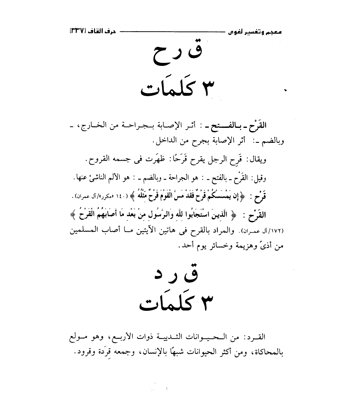 القرح: (الَّذِينَ اسْتَجَابُوا لِلَّهِ وَالرَّسُولِ مِنْ بَعْدِ مَا أَصَابَهُمْ الْقَرْحُ) (172/آل عمران) والمراد بالقرح فى هاتين الآيتين ما أصاب المسلمين من أذى وهزيمة وخسائر يوم أحد.