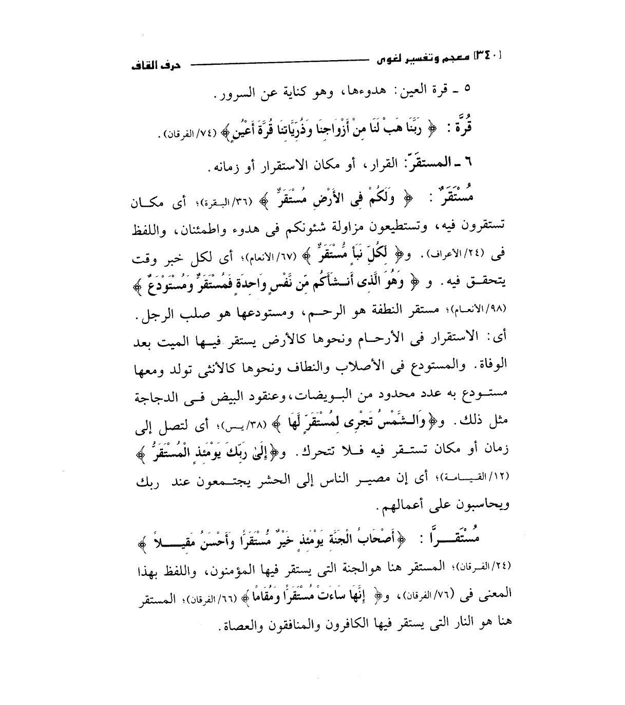 مستقرا: (أَصْحَابُ الْجَنَّةِ يَوْمَئِذٍ خَيْرٌ مُسْتَقَرّاً وَأَحْسَنُ مَقِيلاً) "24/الفرقان " المستقر هنا هو الجنة التي يستقر فيها المؤمنون، واللفظ بهذا المعني في (76/الفرقان " و (إِنَّهَا سَاءَتْ مُسْتَقَرّاً وَمُقَاماً) " 66/الفرقان) المستقر هنا هو النار التي يستقر فيها الكافرون والمنافقون والعصاة.