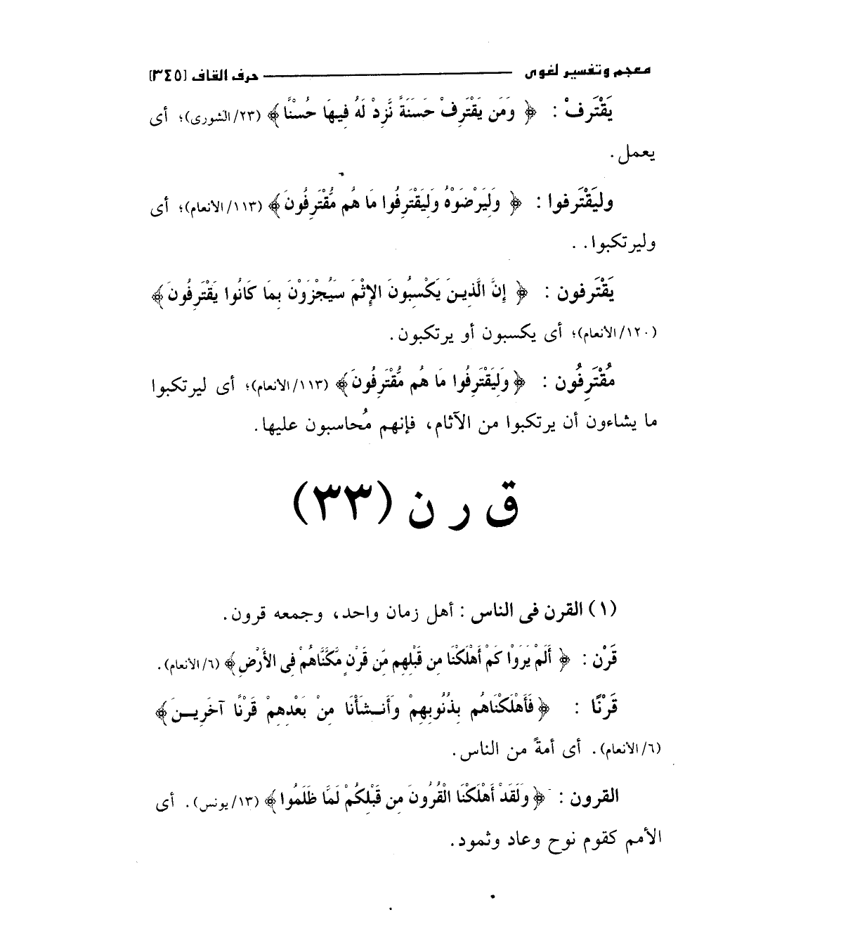 قرن: (أَلَمْ يَرَوْا كَمْ أَهْلَكْنَا مِنْ قَبْلِهِمْ مِنْ قَرْنٍ مَكَّنَّاهُمْ فِي الأَرْضِ) (6/ الأنعام)