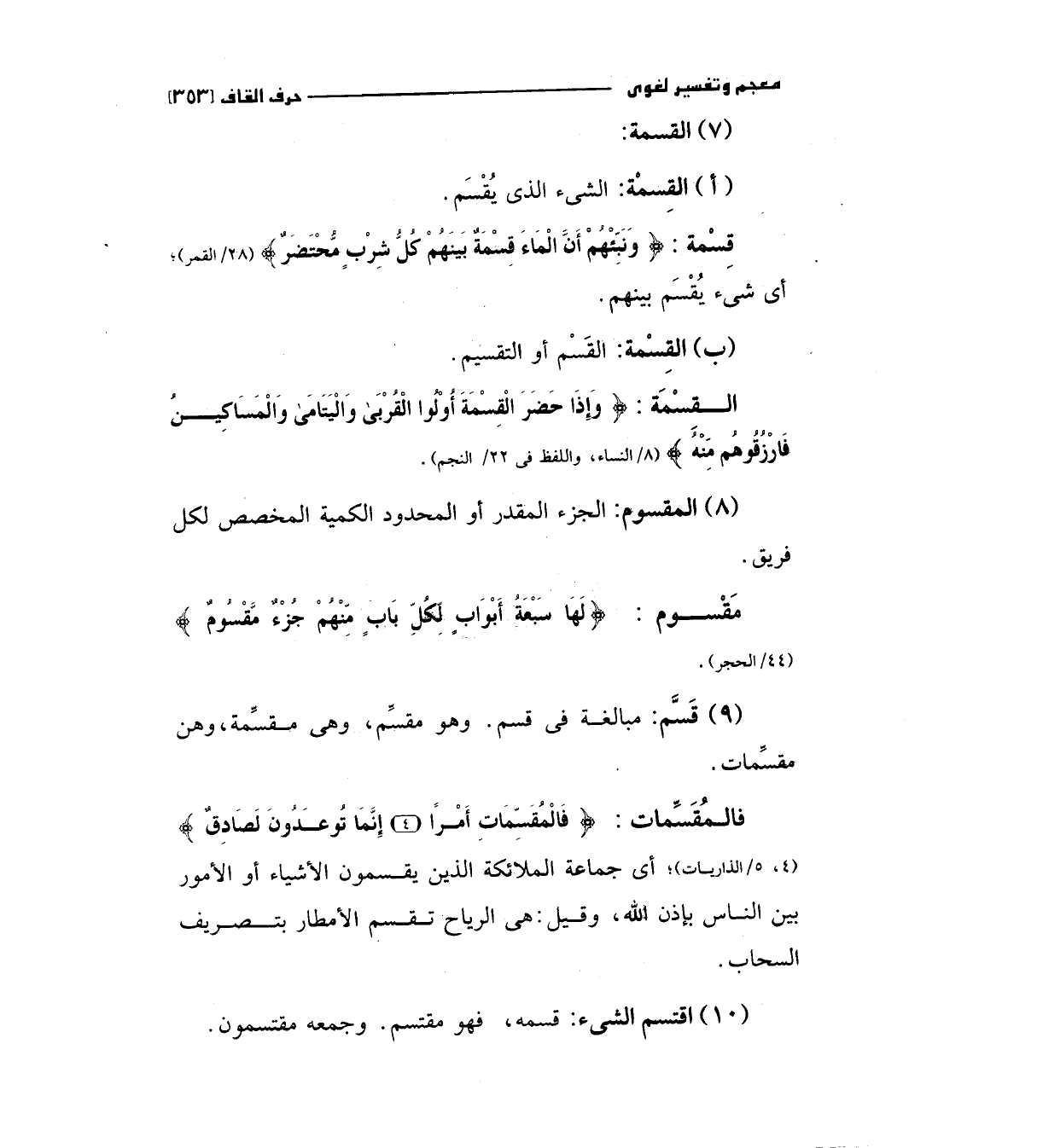 القسمة: (وَإِذَا حَضَرَ الْقِسْمَةَ أُوْلُوا الْقُرْبَى وَالْيَتَامَى وَالْمَسَاكِينُ فَارْزُقُوهُمْ مِنْهُ) " 8/النساء، واللفظ في 22/النجم ".