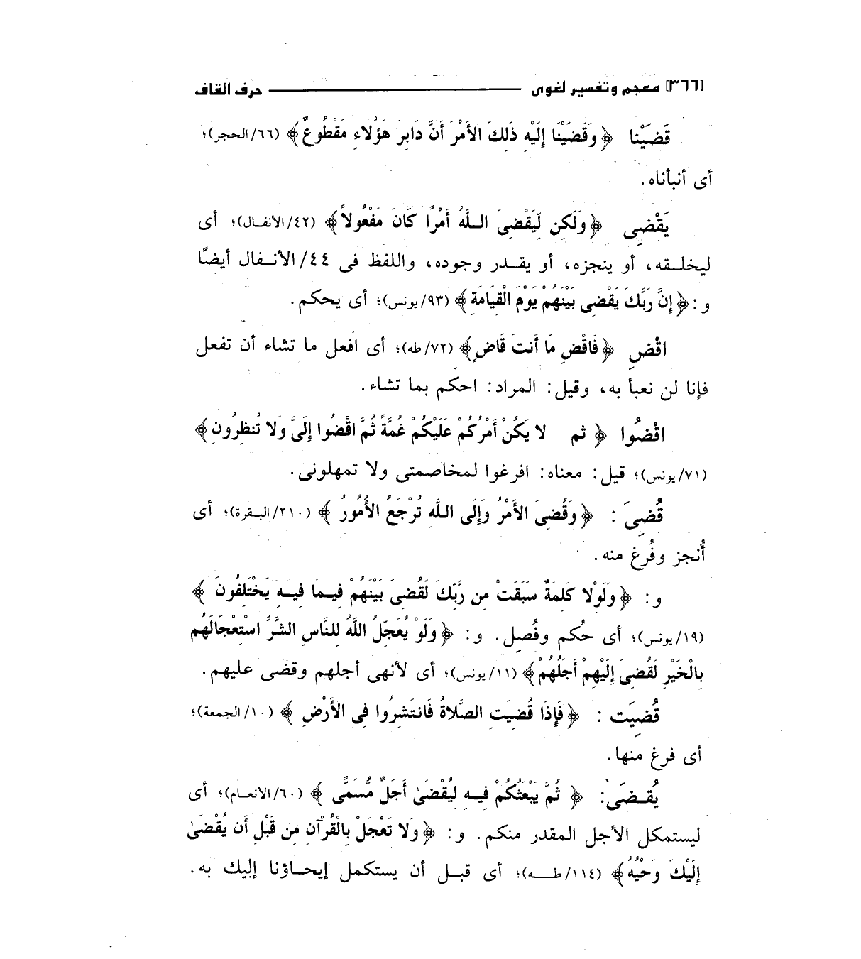 و: (وَلَوْلا كَلِمَةٌ سَبَقَتْ مِنْ رَبِّكَ لَقُضِيَ بَيْنَهُمْ فِيمَا فِيهِ يَخْتَلِفُونَ) " 19/يونس " أي حكم وفصل و: (وَلَوْ يُعَجِّلُ اللَّهُ لِلنَّاسِ الشَّرَّ اسْتِعْجَالَهُمْ بِالْخَيْرِ لَقُضِيَ إِلَيْهِمْ أَجَلُهُمْ) " 11/يونس " أي لأنهي أجلهم وقضي عليهم قضيت: (فَإِذَا قُضِيَتْ الصَّلاةُ فَانتَشِرُوا فِي الأَرْضِ) " 10/الجمعة ".