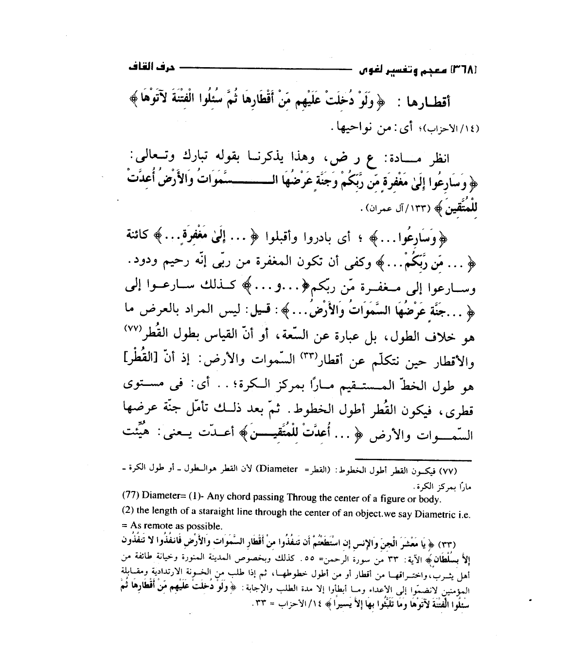 أنظر مادة ع ر ض، وهذا يذكرنا بقوله تبارك وتعالي: (وَسَارِعُوا إِلَى مَغْفِرَةٍ مِنْ رَبِّكُمْ وَجَنَّةٍ عَرْضُهَا السَّمَوَاتُ وَالأَرْضُ أُعِدَّتْ لِلْمُتَّقِينَ) " 133/آل عمران ".
