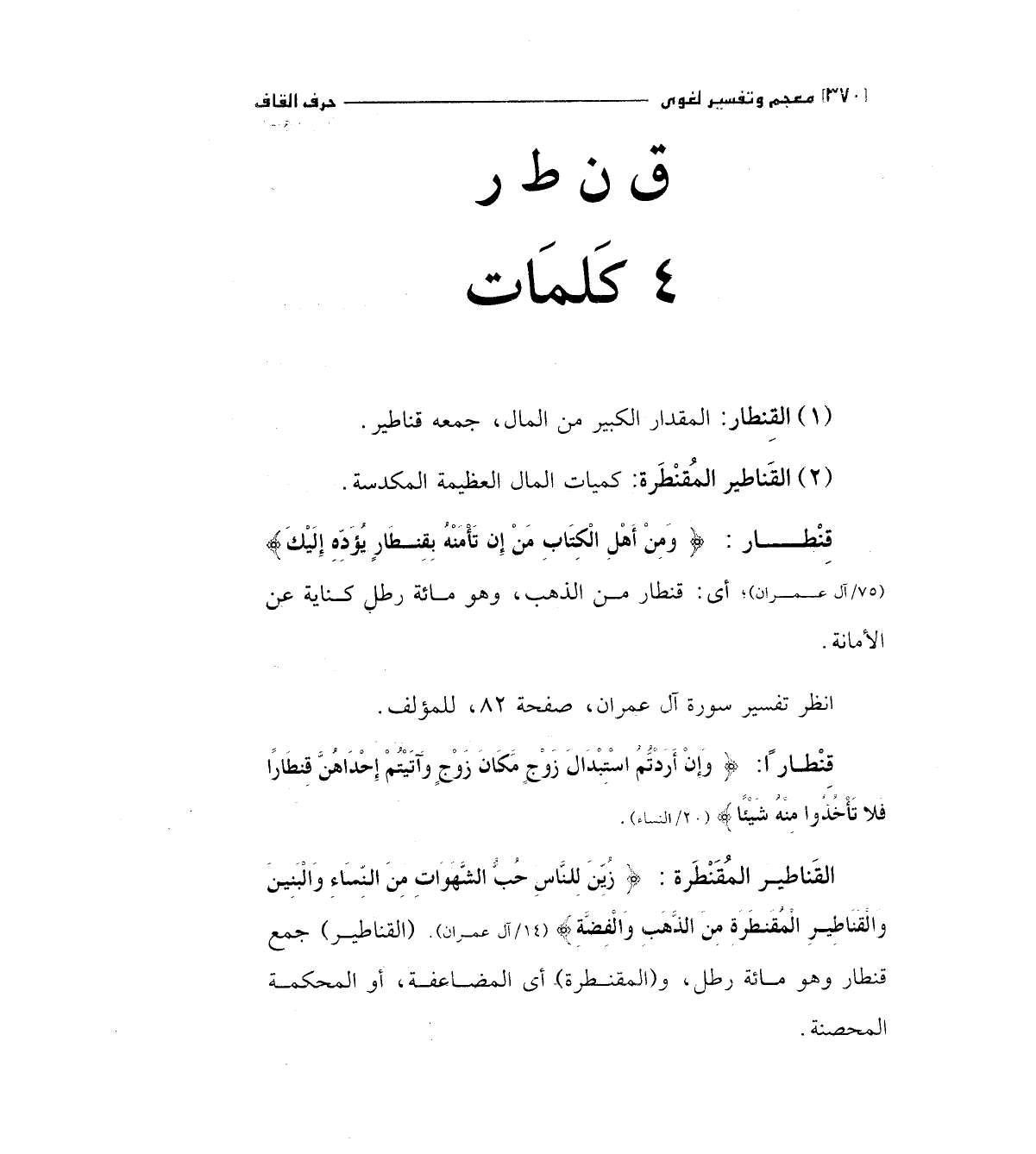 قنطار: (وَمِنْ أَهْلِ الْكِتَابِ مَنْ إِنْ تَأْمَنْهُ بِقِنطَارٍ يُؤَدِّهِ إِلَيْكَ) "75/آل عمران" أي: فنطار من الذهب وهو مائة رطل كناية عن الأمانة.