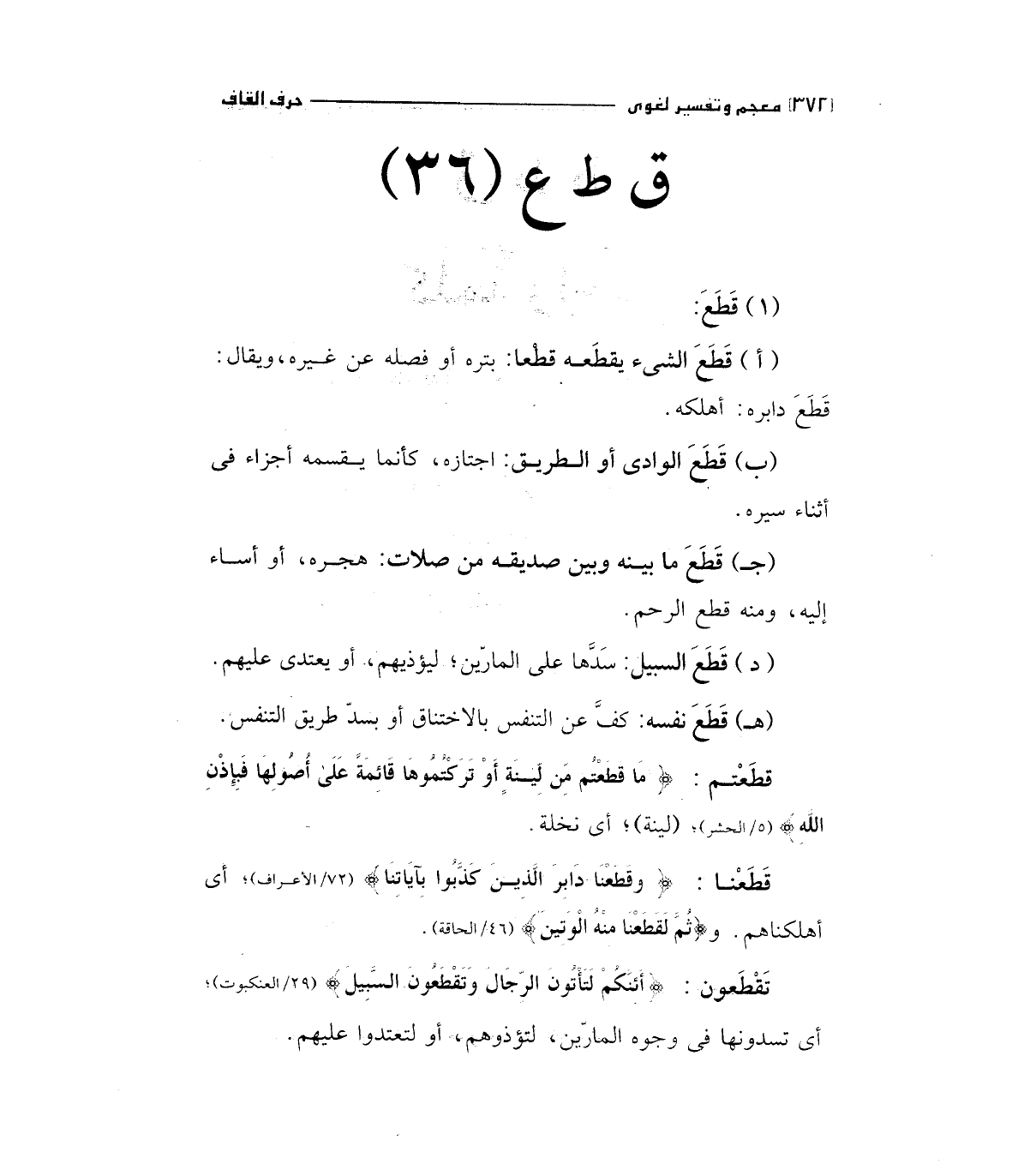أ- قطع الشئ يقطعه قطعا: يتره أو فصله عن غيره، ويقال قطع دابره: أهلكه.