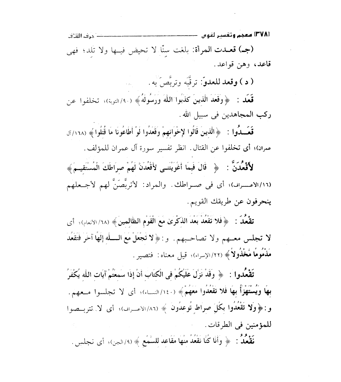تقعد: (فَلا تَقْعُدْ بَعْدَ الذِّكْرَى مَعَ الْقَوْمِ الظَّالِمِينَ) "68/الأنعام أي لا تجلس معهم ولا تصاحبهم و: (لا تَجْعَلْ مَعَ اللَّهِ إِلَهاً آخَرَ فَتَقْعُدَ مَذْمُوماً مَخْذُولاً) "22/الإسراء "قيل معناه: فتصير.