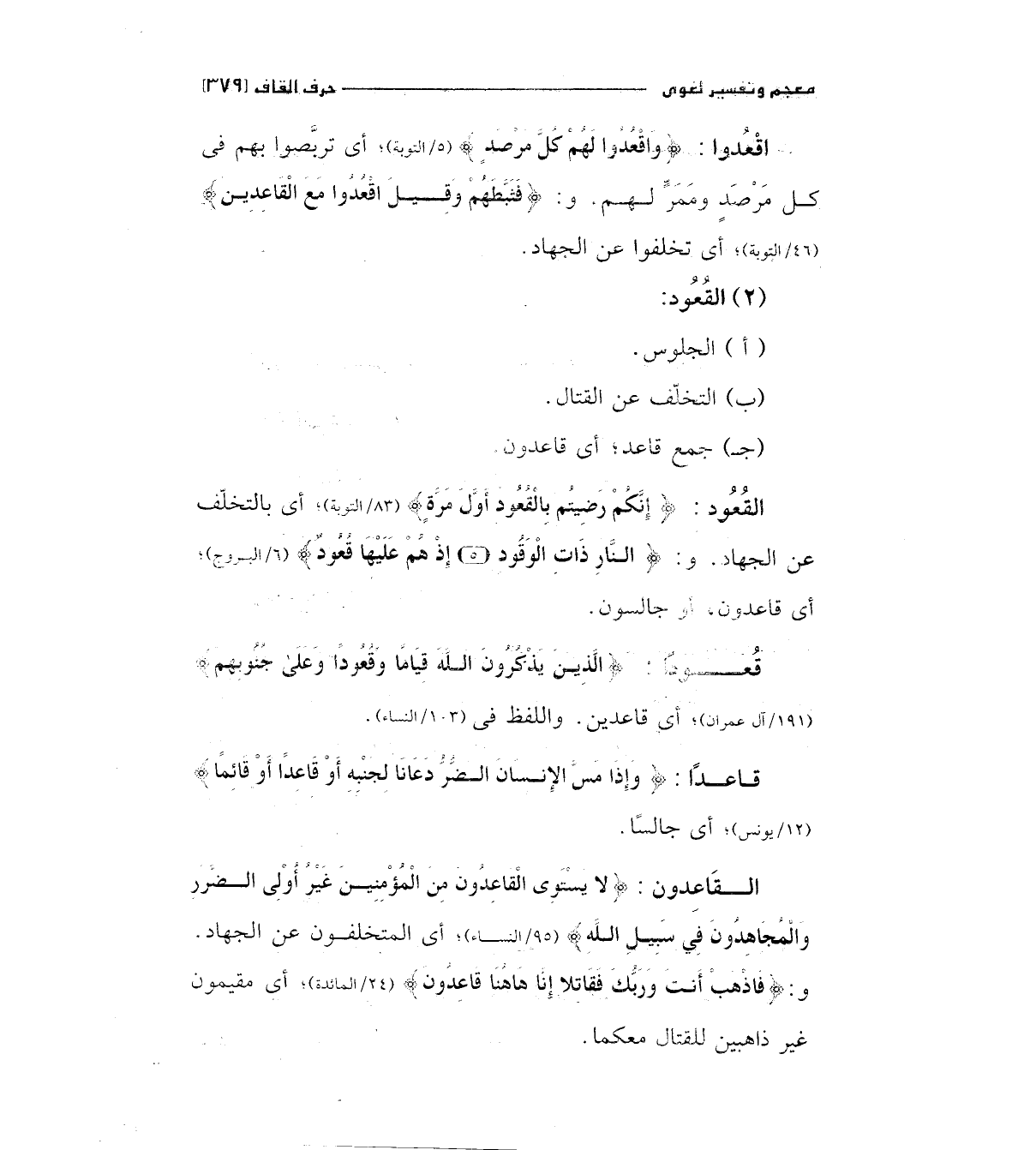 ث القعود: (إِنَّكُمْ رَضِيتُمْ بِالْقُعُودِ أَوَّلَ مَرَّةٍ) " 83/التوبة " أي بالتخلف عن الجهاد. و: (النَّارِ ذَاتِ الْوَقُودِ إِذْ هُمْ عَلَيْهَا قُعُودٌ) "6/البروج " أي قاعدون، أو جالسون.