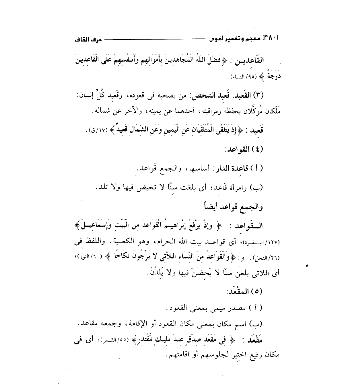 القواعد: (وَإِذْ يَرْفَعُ إِبْرَاهِيمُ الْقَوَاعِدَ مِنْ الْبَيْتِ وَإِسْمَاعِيلُ) "127/البقرة " أي قواعد بيت الله الحرام، وهو الكعبة، واللفظ في " 26/النحل " و: (وَالْقَوَاعِدُ مِنْ النِّسَاءِ اللاَّتِي لا يَرْجُونَ نِكَاحاً) " 60/النور " أي اللاتي بلغن سنا لا يحضن فيها ولا يلدن.