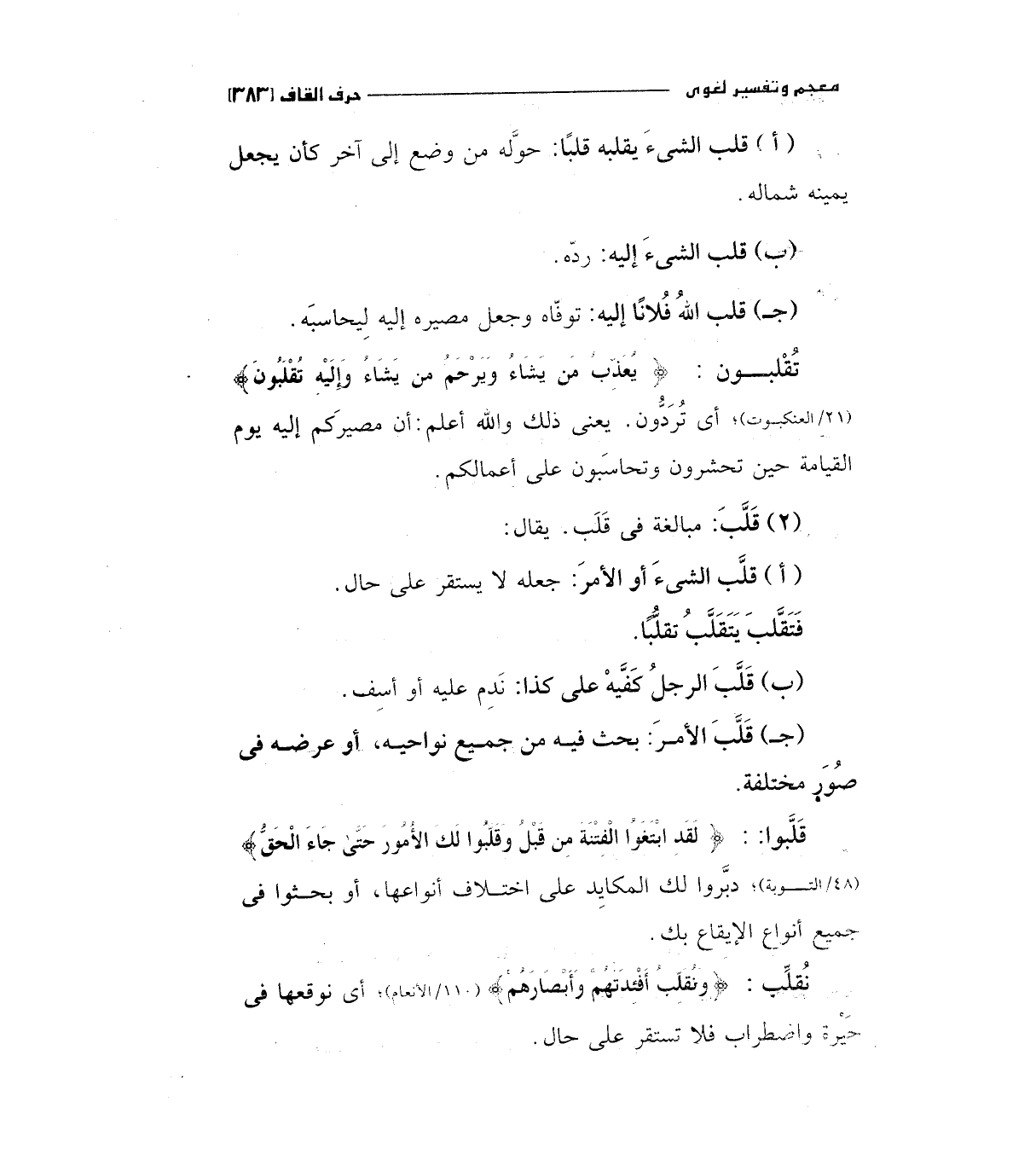 ج قلبوا: (لَقَدْ ابْتَغَوْا الْفِتْنَةَ مِنْ قَبْلُ وَقَلَّبُوا لَكَ الأُمُورَ حَتَّى جَاءَ الْحَقُّ) " 48/التوبة " دبروا لك المكايد علي اختلاف أنواعها، أو يحثوا في جميع أنواع الإيقاع بك.