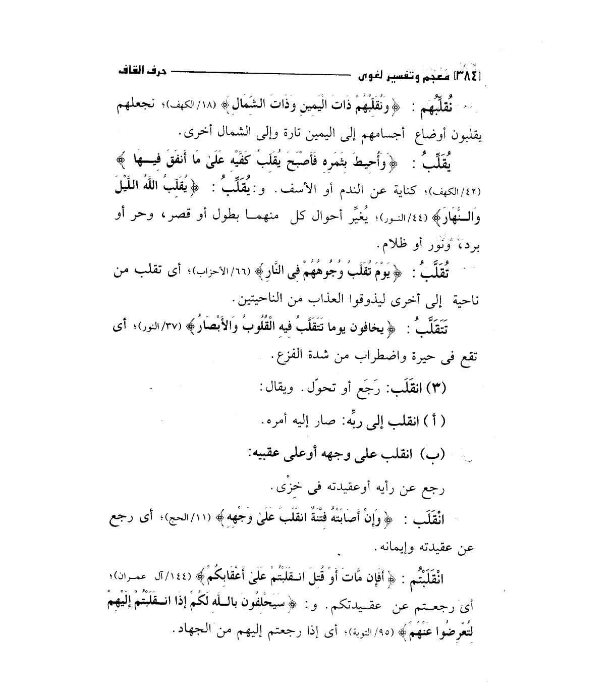 يقلب: (وَأُحِيطَ بِثَمَرِهِ فَأَصْبَحَ يُقَلِّبُ كَفَّيْهِ عَلَى مَا أَنفَقَ فِيهَا) " 42/الكهف " كناية عن الندم أو الأسف. ويقلب: (يُقَلِّبُ اللَّهُ اللَّيْلَ وَالنَّهَارَ) " 44/النور " يغير أحوال كل منهما بطول أو قصر، وحر أو برد، ونور أو ظلام.
