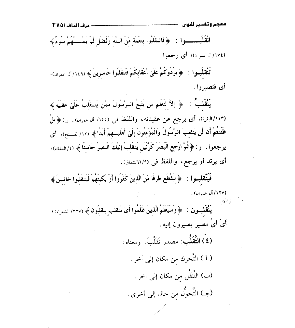 ينقلب: (إِلاَّ لِنَعْلَمَ مَنْ يَتَّبِعُ الرَّسُولَ مِمَّنْ يَنقَلِبُ عَلَى عَقِبَيْهِ) " 143/البقرة " أي يرجع عن عقيدته، واللفظ في (144/آل عمران " و: (بَلْ ظَنَنْتُمْ أَنْ لَنْ يَنْقَلِبَ الرَّسُولُ وَالْمُؤْمِنُونَ إِلَى أَهْلِيهِمْ أَبَداً) " 12/الفتح " أي يرجعوا. و: (ثُمَّ ارْجِعْ الْبَصَرَ كَرَّتَيْنِ يَنقَلِبْ إِلَيْكَ الْبَصَرُ خَاسِئاً) " 4/الملك "أي يرتد أو يرجع واللفظ في (9/الانشقاق).