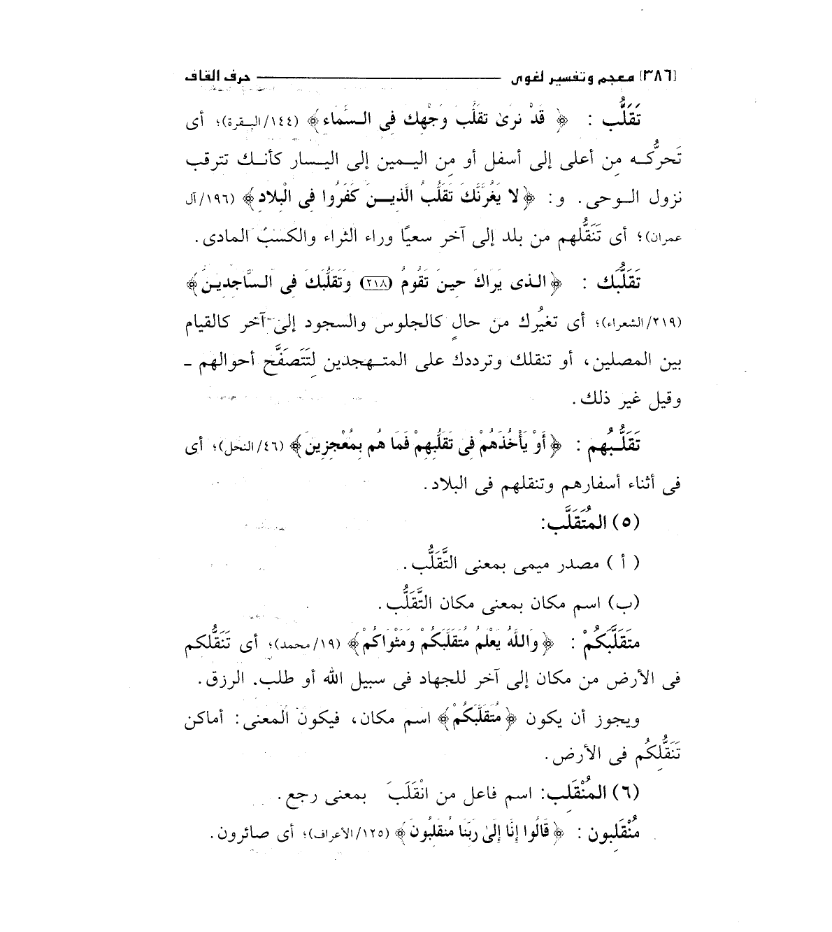 تقلب: (قَدْ نَرَى تَقَلُّبَ وَجْهِكَ فِي السَّمَاءِ) " 144/البقرة " أي تحركه من أعلي إلي أسفل أو من اليمين إلي اليسار كأنك تترقب نزول الوحي و: (لا يَغُرَّنَّكَ تَقَلُّبُ الَّذِينَ كَفَرُوا فِي الْبِلادِ) " 196/آل عمران ".أي تنقلهم من بلد إلي آخر سعيا وراء الثراء والكسب المادي تقلبك: (الَّذِي يَرَاكَ حِينَ تَقُومُ (218) وَتَقَلُّبَكَ فِي السَّاجِدِينَ) "219/الشعراء"أي تغيرك من حال كالجلوس والسجود إلي آخر كالقيام بين المصلين، أو تنقلك وترددك علي المتهجدين لتتصفح أحوالهم - وقيل غير ذلك.