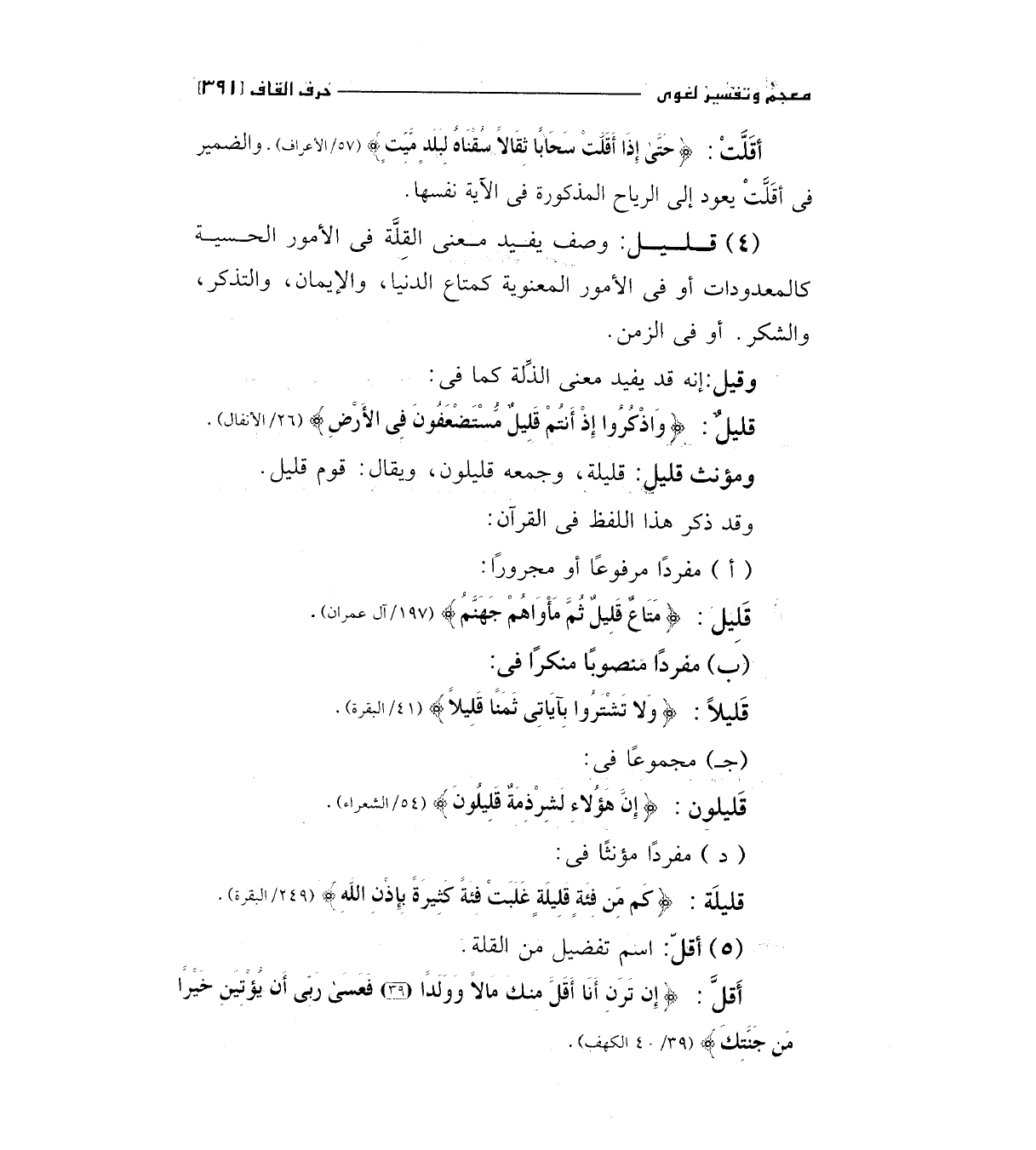5 - قليل: وصف يفيد معني القلة في الأمور الحسية كالمعدودات أو في الأمور المعنوية كمتاع الدنيا، والإيمان، والتذكر، والشكر، أو في الزمن.