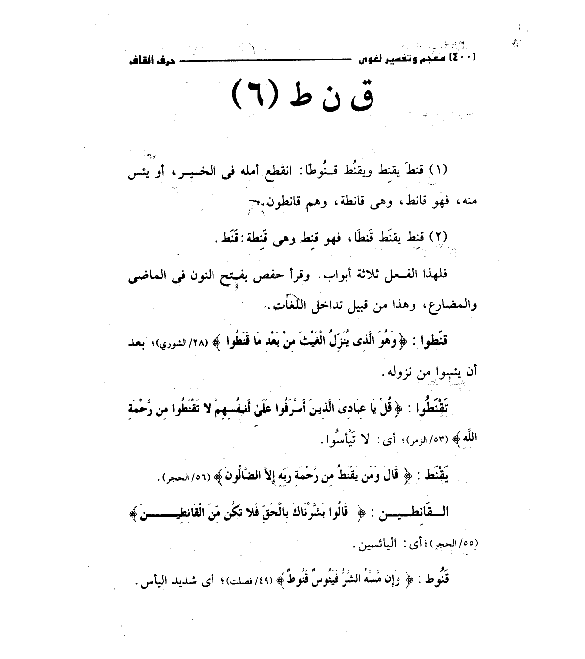 1 - قنط يقنط قنوط: انقطع أمله في الخير، أو يئس منه، فهو قانط، وهي قانطة وهم قانطون.