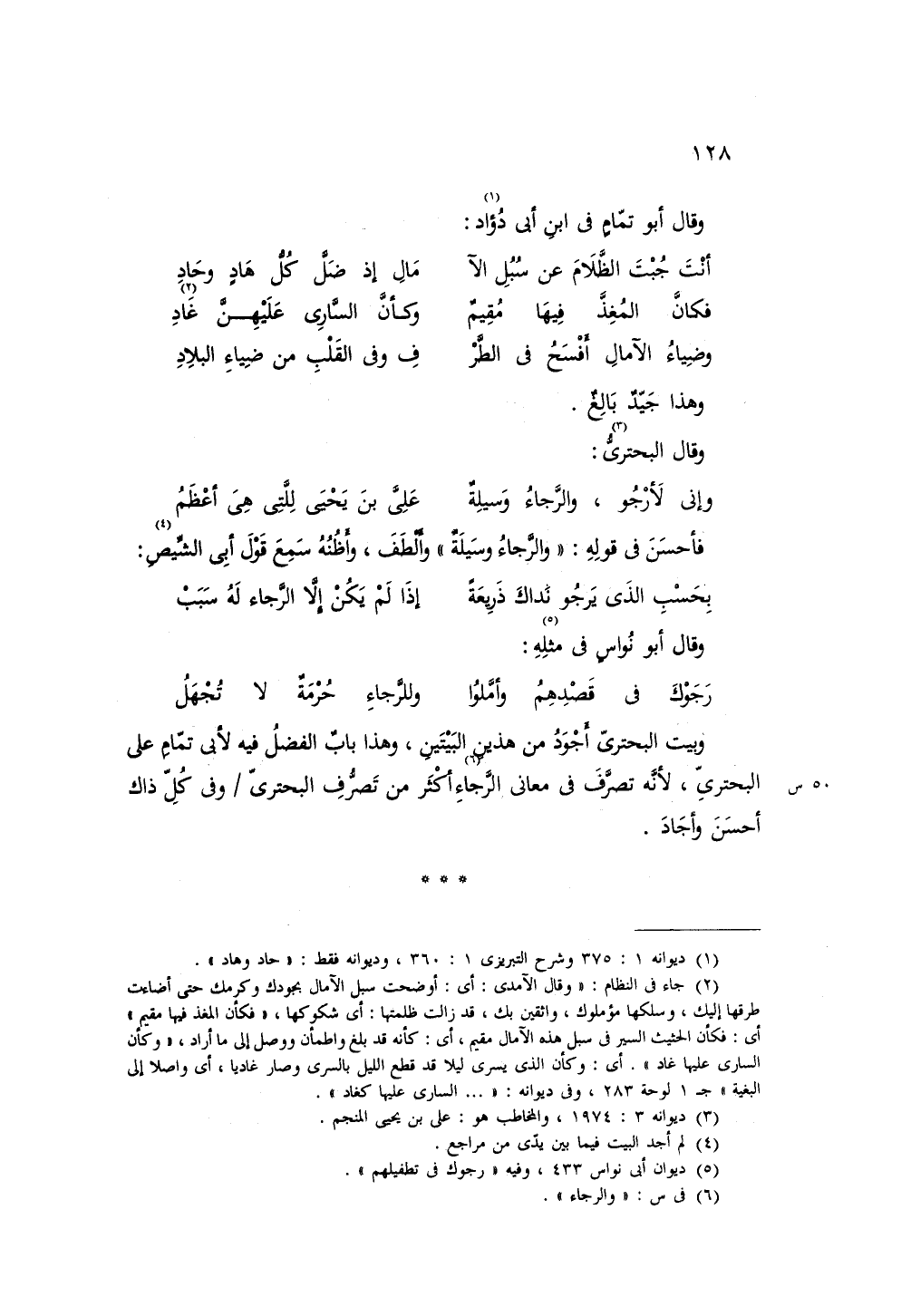 وبيت البحتري أجود من هذين البيتين، وهذا باب الفضل فيه لأبي تمام على البحتري، لأنه تصرف في معاني الرجاء أكثر من تصرف البحتري وفي كل ذاك أحسن وأجاد.