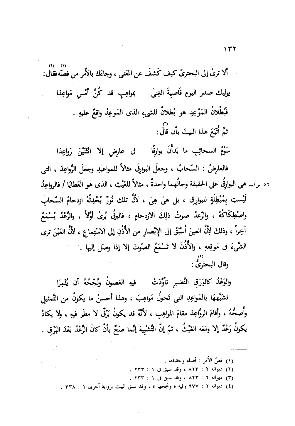 فالعارض: السحاب، وجعل البوارق مثالاً للمواعيد وجعل الرواعد التي هي البوارق على الحقيقة وحالهما واحدة، مثالاً للغيث، الذي هو العطايا فالرواعد ليست بمبطلة للبوارق، بل هي هي، لأن تلك نور يحدثه ازدحام السحاب واصطكاكه، والرعد صوت ذلك الازدحام، فالبرق يرى أولاً، والرعد يسمع ثانياً، وذلك لأن العين أسبق إلى الإبصار من الأذن إلى الاستماع، لأن العين ترى الشيء في موقعه، والأذن لا تسمع الصوت إلا إذا وصل إليها.