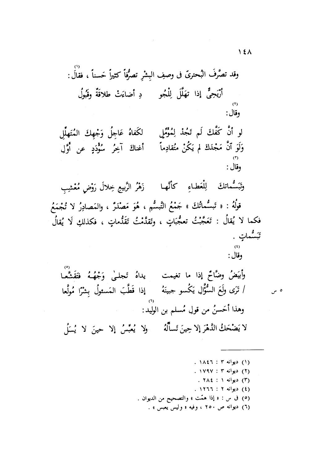 وقد تصرف البحتري في وصف البشر تصرفاً كثيراً حسناً، فقال: