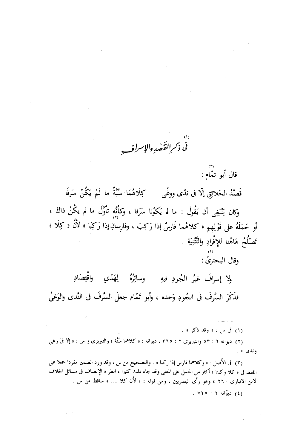 وكان ينبغي أن يقول: ما لم يكونا سرفا، وكأنه تأول ما لم يكن ذاك، أو حمله على قولهم «كلاهما فارس إذا ركب، وفارسان إذا ركبا» لأن كلا تصلح ها هنا للإفراد والتثنية.