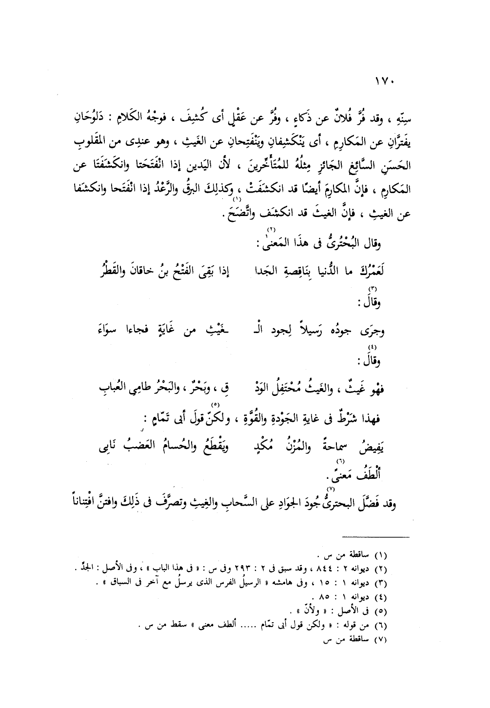 سنه وقد فر فلان عن ذكاء، وفر عن عقل أي كشف، فوجه الكلام: دلوحان يفتران عن المكارم، أي ينكشفان وينفتحان عن الغيث، وهو عندي من المقلوب الحسن السائغ الجائز مثله للمتأخرين، لأن اليدين إذا انفتحتا وانكشفتا عن المكارم فإن المكارم أيضاً قد انكشفت، وكذلك البرق والرعد إذا انفتحا وانكشفا عن الغيث، فإن الغيث قد انكشف واتضح.