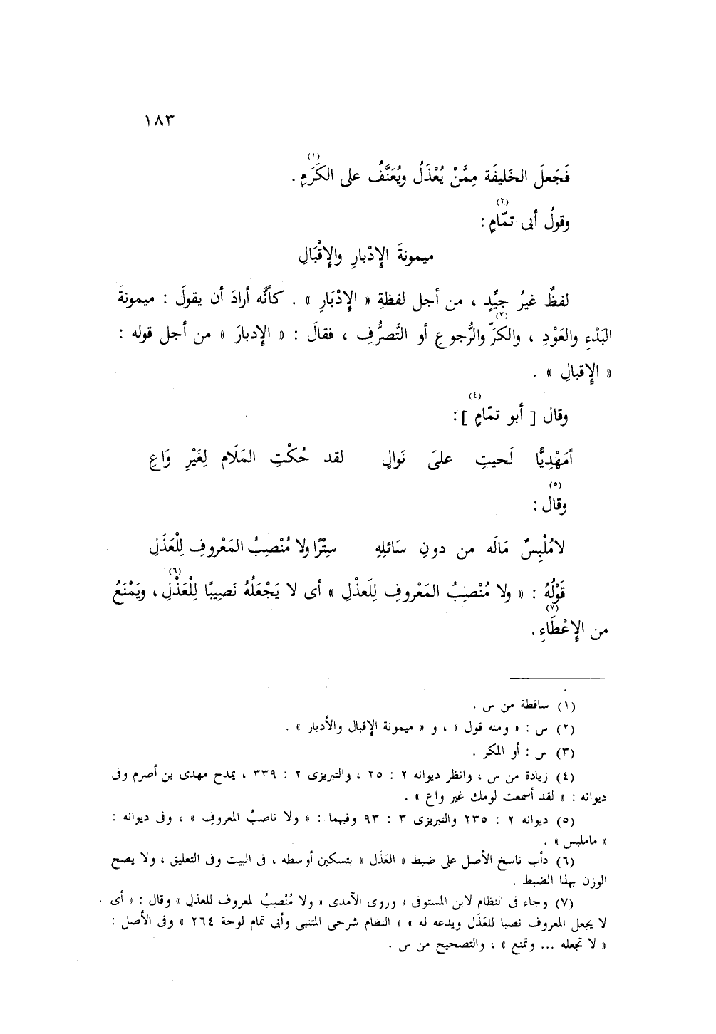 لفظ غير جيد، من أجل لفظة «الإدبار» كأنه أراد أن يقول: ميمونة البدء والعود، والكر والرجوع أو التصرف، فقال: «الإدبار» من أجل قوله «الإقبال».