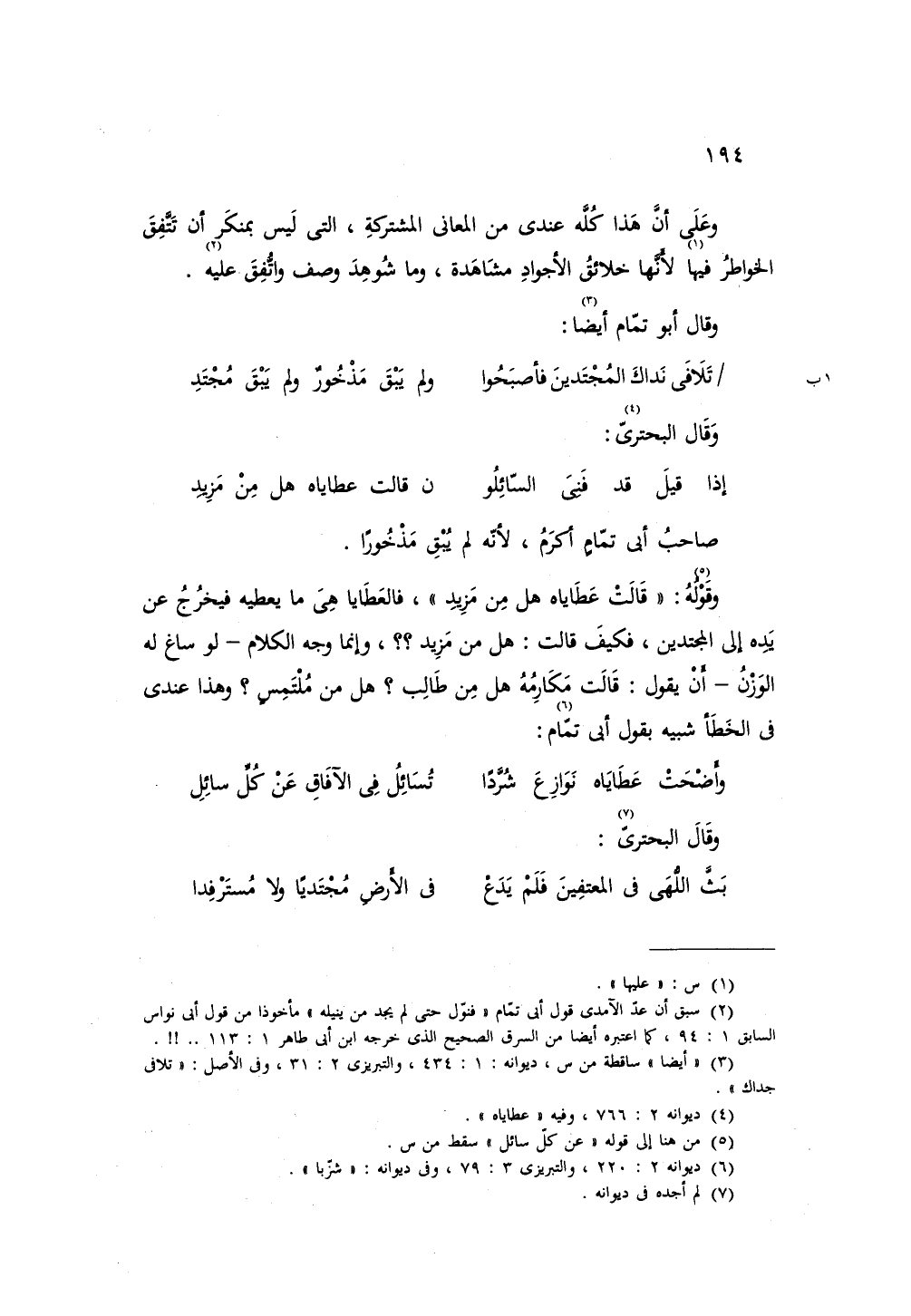 وقوله: «قالت عطاياه هل من مزيد»، فالعطايا هي ما يعطيه فيخرج عن يده إلى المجتدين، فكيف قالت: هل من مزيد؟؟، وإنما وجه الكلام لو ساغ له الوزن أن يقول: قالت مكارمه هل من طالب؟، هل من ملتمس؟، وهذا عندي في الخطايا شبيه بقول أبي تمام: